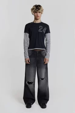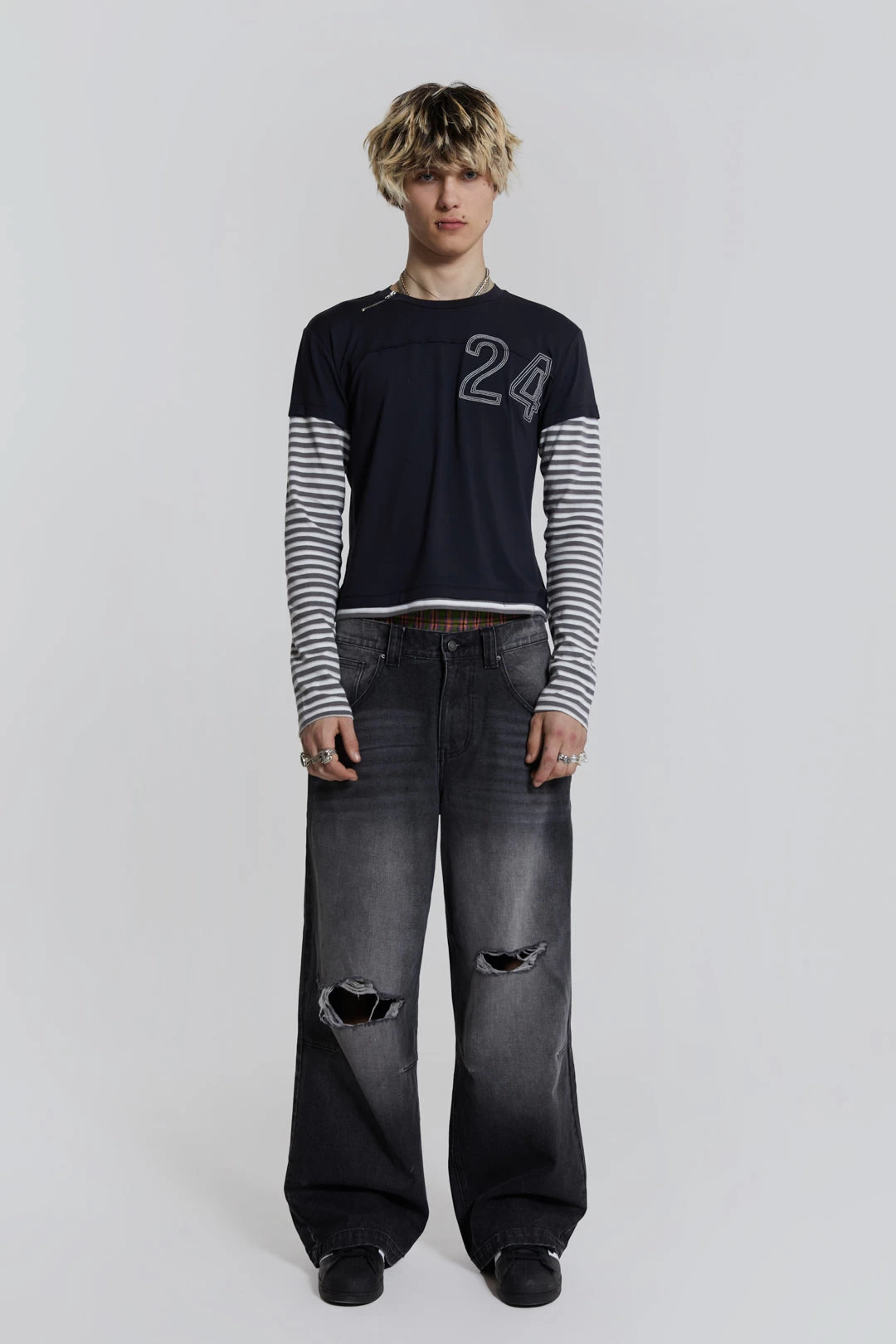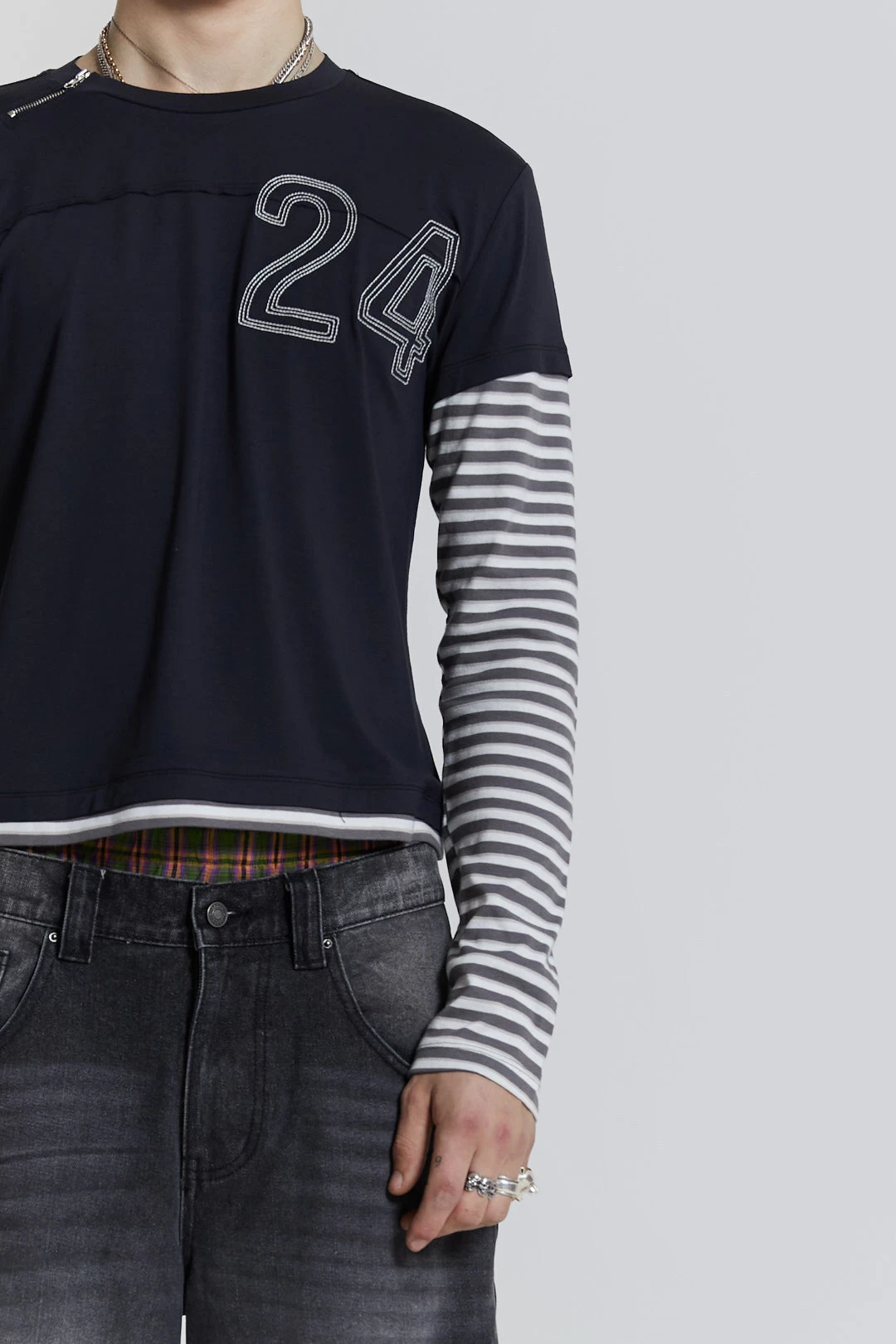 The 24 Slayer Tee is crafted from a soft brushed jersey fabric, featuring a mock double layer long sleeve, yarn-dyed stripe jersey sleeve and expose raw seam front yoke. This design also includes a Ëœ24′ embroidery detail with a antique silver zip opening on the neck.