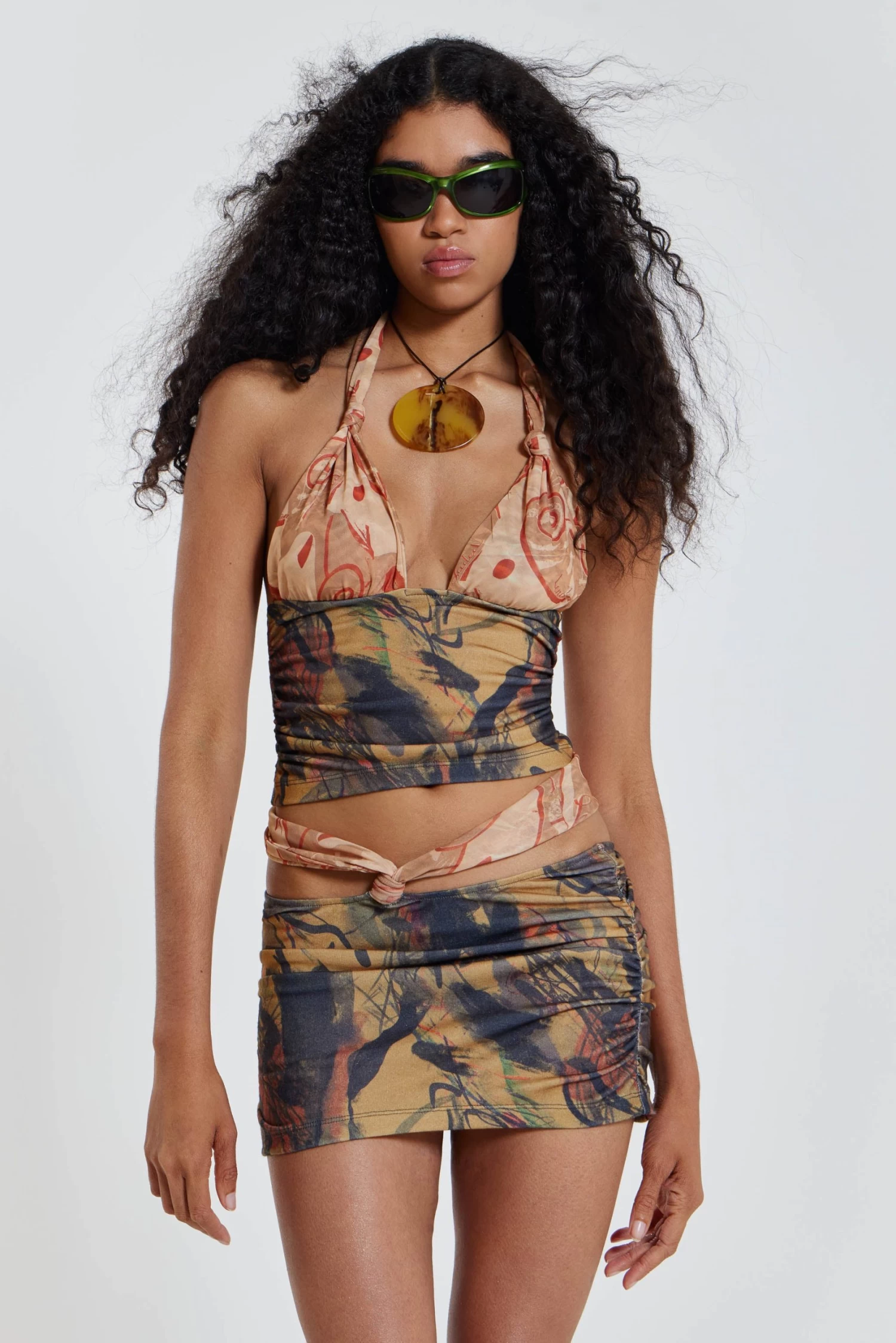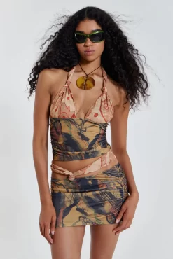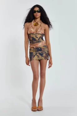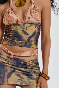 The Ammos Skirt is crafted in an earthy print lightweight fabric with a gathered front with knot detail, featuring a mini length and cut out sides. Complete the ensemble with the matching beach top.