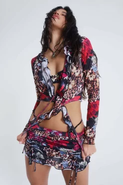 Grunge inspired, our dark romantic leopard print beach shirt features a ruffed detail with a tie up front.