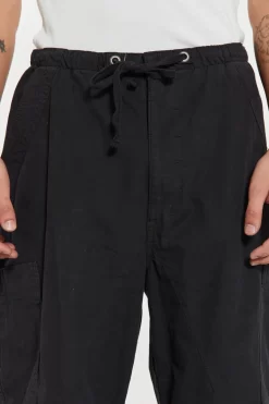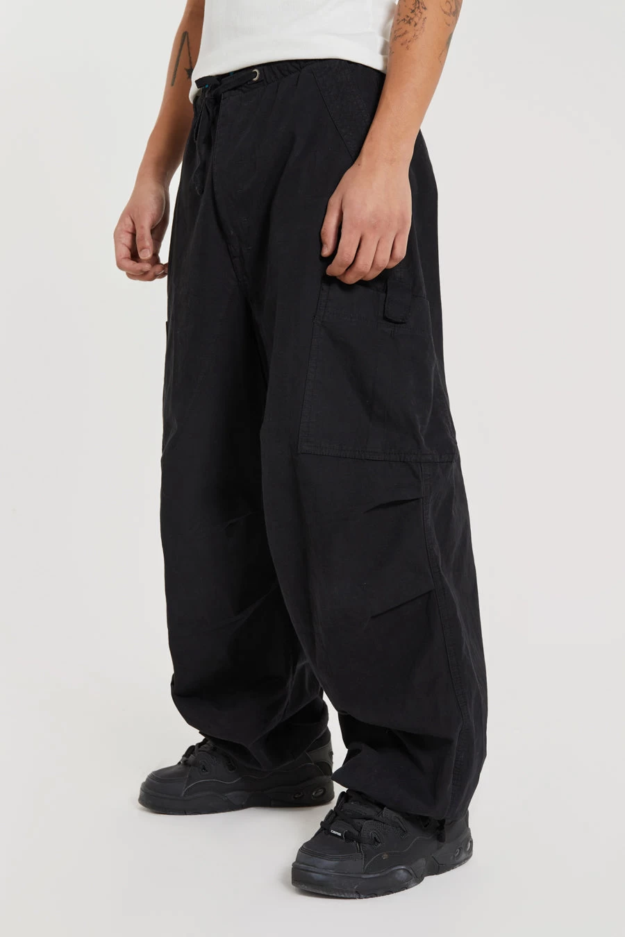 Designed with an oversized fit and a combination of metal eyelets, zip fly and adjustable cotton drawcord, our Black Parachute Cargo Pants deliver refined luxury and ultimate comfort. Details such as a pleated knee and inside leg darts ensure a perfect fit, while a six-pocket styling and a unique airpod pocket provide functional convenience. Elevate any look with this timeless and classic silhouette.