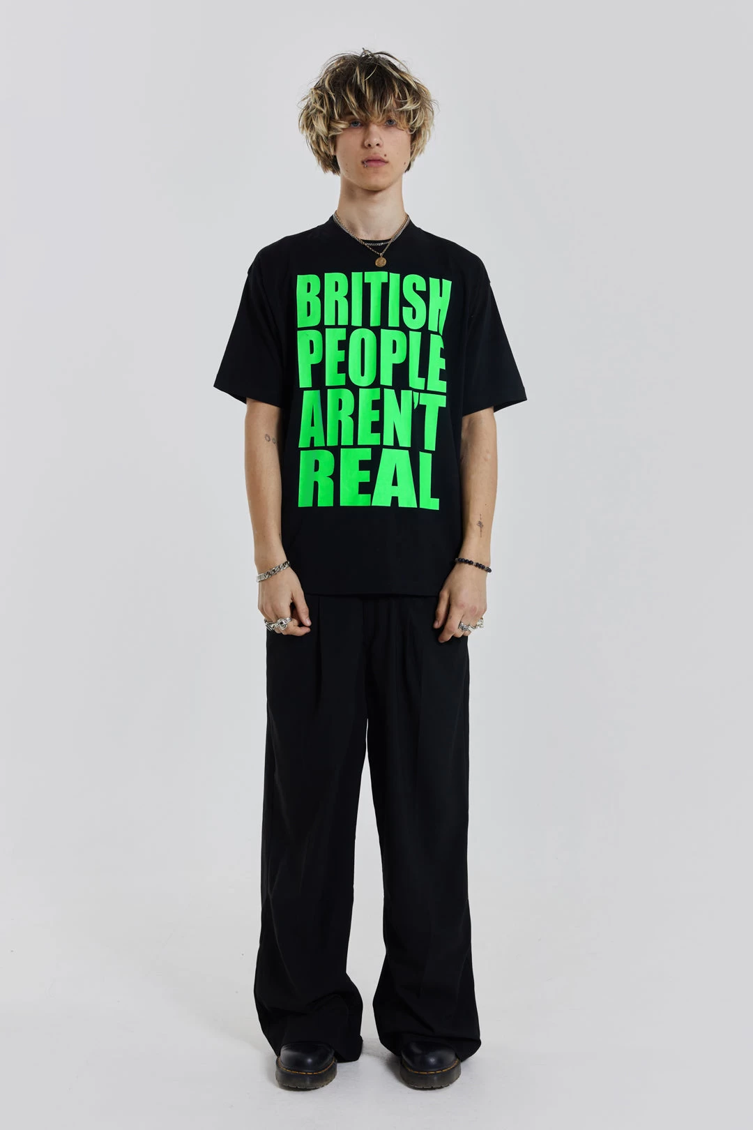 Introducing the British People Tee. Crafted from single jersey fabric, this oversized t-shirt features a bold neon green ËœBritish people aren’t real’ screen print.