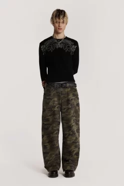 Our take on the iconic baggy silhouette loved throughout the 90’s and early 2000’s in skate, hip hop & rave subcultures, with an updated, modern twist. The green camo print Colossus jeans are crafted from lightweight slub denim.