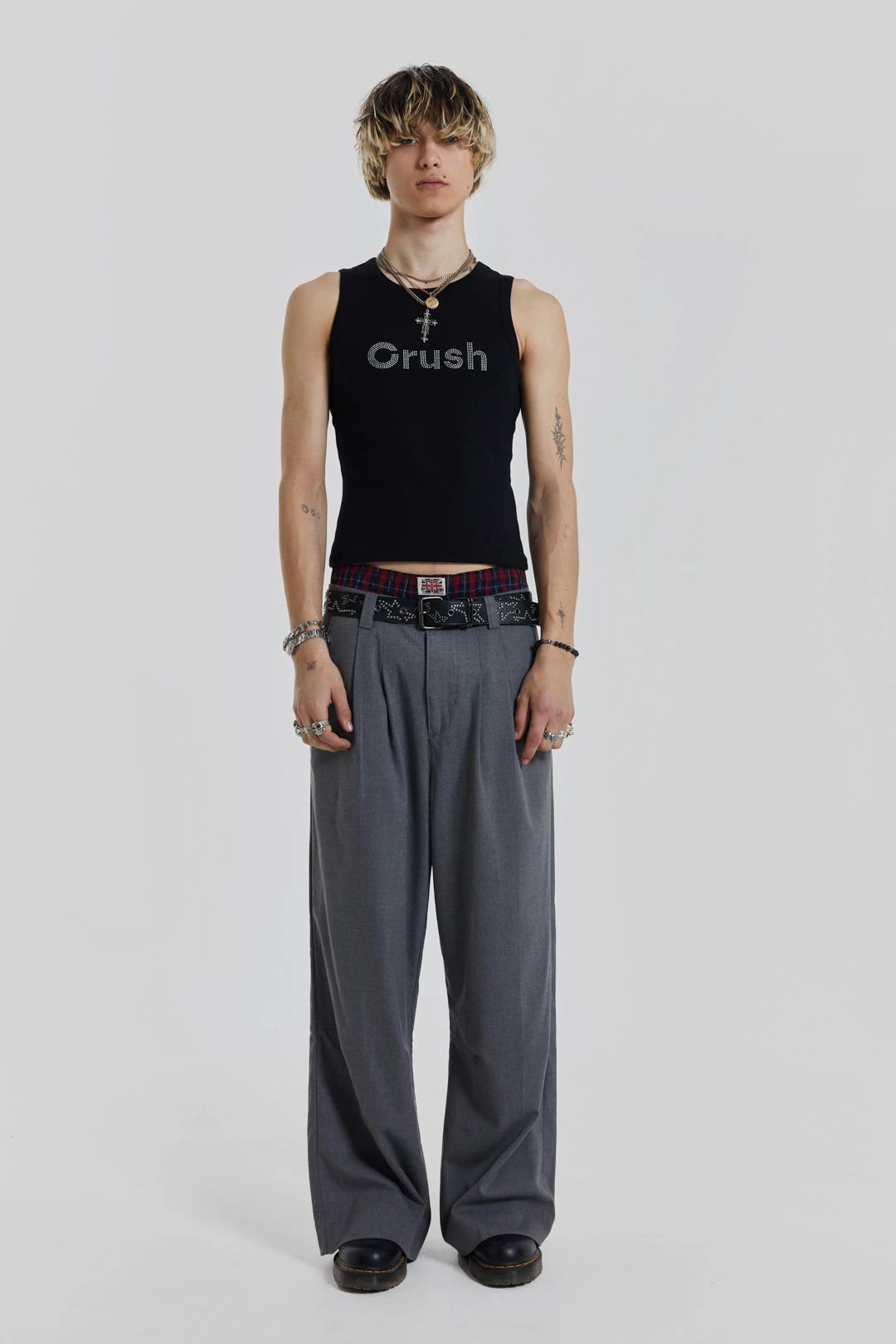 Our Crush Rhinestone Vest is crafted from a black single jersey fabric, combined with a rhinestone ‘Crush’ slogan. This vest offers a comfortable fit with its shrunken silhouette.