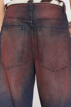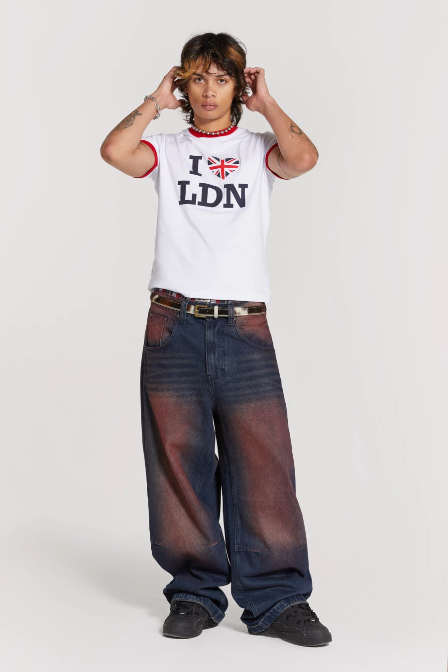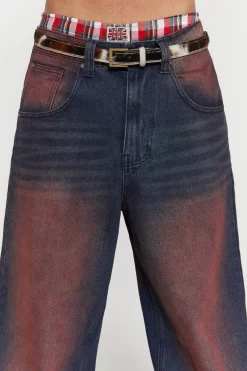 Our take on the iconic baggy silhouette loved throughout the 90’s and early 2000’s in skate, hip hop & rave subcultures, with an updated, modern twist. The red sandblast Colossus jeans are crafted from heavyweight denim.