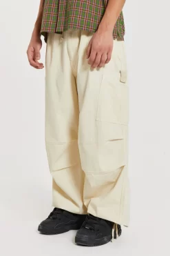 Designed with an oversized fit and a combination of metal eyelets, zip fly and adjustable cotton drawcord, our Ecru Parachute Cargo Pants deliver refined luxury and ultimate comfort. Details such as a pleated knee and inside leg darts ensure a perfect fit, while a six-pocket styling and a unique airpod pocket provide functional convenience. Elevate any look with this timeless and classic silhouette.