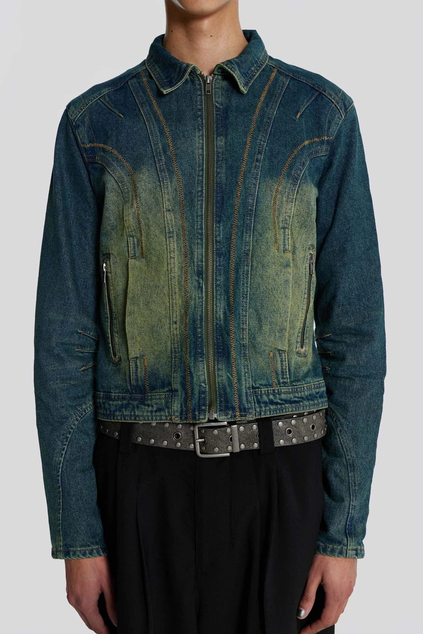 Crafted from a heavyweight blue denim with green sandblast, the Exhaust Sandblast Denim Jacket boasts a zigzag stitch detail, a zip cuff opening with darts at the back and finished with a slightly cropped, shrunken fit.