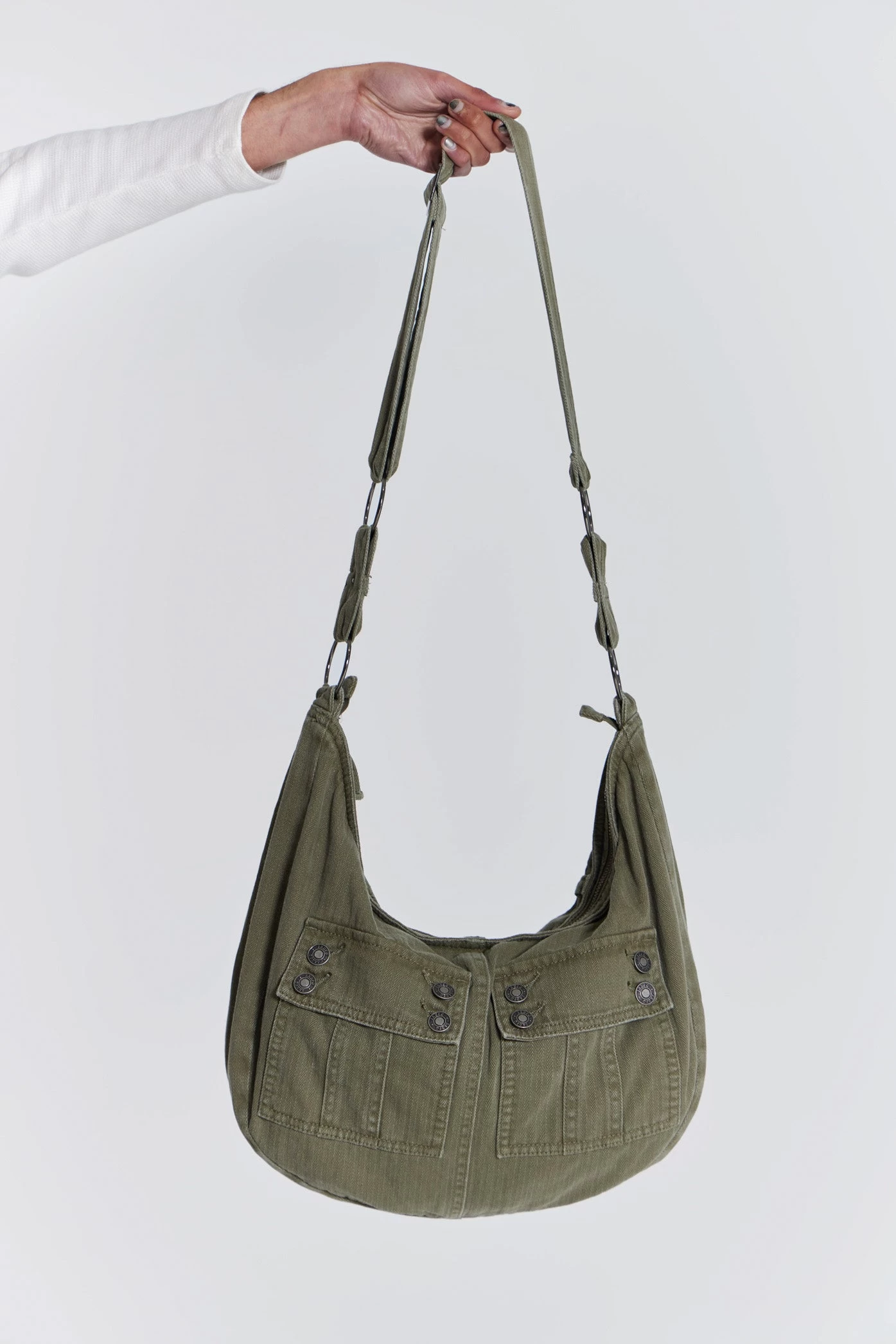 The Freight Sling Bag is crafted from a herringbone twill fabric with an adjustable strap. The bag features double cargo pockets and finished with silver hardware detailing.