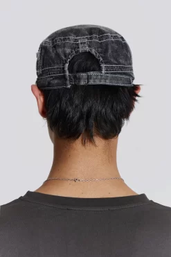 Introducing the Grey Denim Collide Hat “ crafted from a grey slub denim fabric, this military style cap features a layered discharge print with an adjustable strap at back.