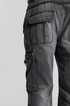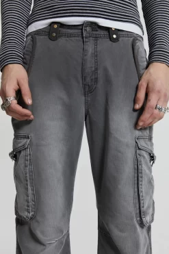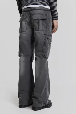 These grey slub denim cargos are crafted from a lightweight denim fabric in a straight, flare leg profile. The design features cargo pockets to sides and back and sits in a mid-low rise fit.