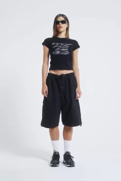 Discover the unparalleled comfort and style of the Black Parachute Cargo Shorts. These shorts feature an oversized fit and six-pocket styling, accompanied by an elasticated waistband and adjustable cotton drawcord for added flexibility.