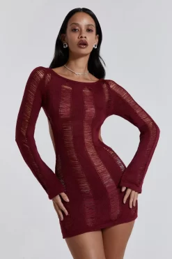 Introducing the Burgundy Umbra Shredded Mini Dress, a refined design with a backless style and long sleeves. Crafted from a shredded laddered knitted fabric, this style is constructed in a mini-length, a core wardrobe staple.