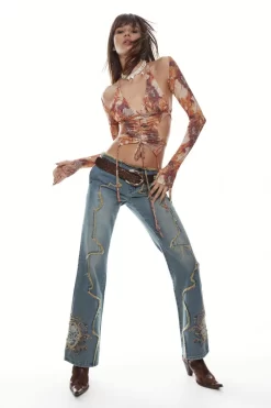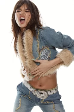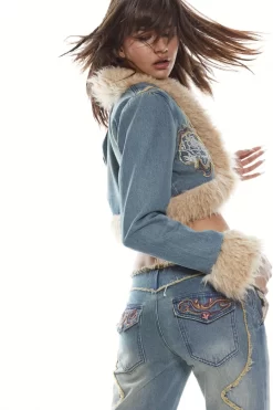 Y2K Cropped Denim Jacket with Faux Horn Toggle, Frayed Panel Detail & Flower Embroidery