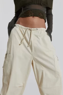 Designed with an oversized fit and a combination of metal eyelets, zip fly and adjustable cotton drawcord, our Ecru Parachute Cargo Pants deliver refined luxury and ultimate comfort. Details such as a pleated knee and inside leg darts ensure a perfect fit, while a six-pocket styling and a unique airpod pocket provide functional convenience. Elevate any look with this timeless and classic silhouette.