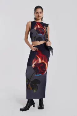 Introducing the Flaming Rose Raw Edge Tank Top. Crafted from a slinky jersey and finished with a raw edge, this top features a classic crew neck and a striking flaming rose print. A matching skirt is also available to complete the ensemble.
