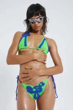 Upgrade your summer wardrobe with the Kauai Crochet Bikini Top. Crafted from a green and blue crochet, this bikini top features a blue floral detail with tie back neck and back, complete your look with the matching bikini bottoms.