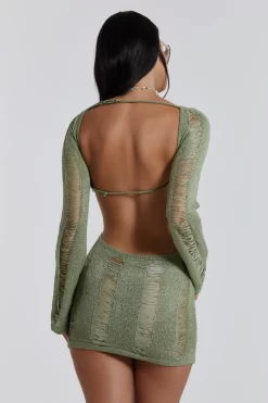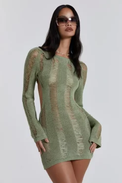Introducing the Khaki Umbra Shredded Mini Dress, a refined design with a backless style and long sleeves. Crafted from a shredded laddered knitted fabric, this style is constructed in a mini-length, a core wardrobe staple.