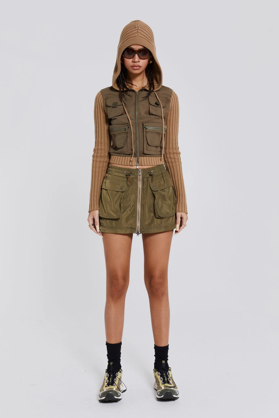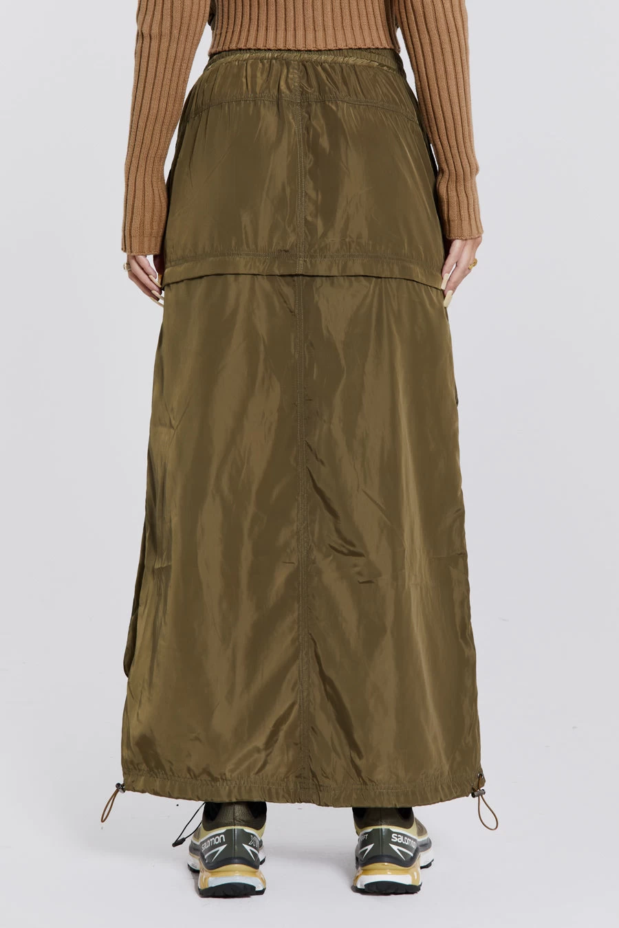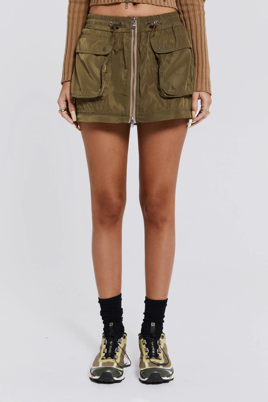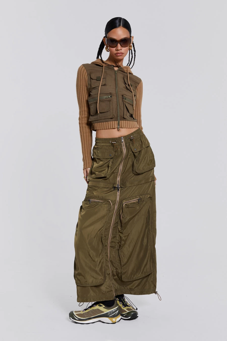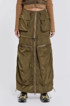 Introducing the Madison 2 in 1 Cargo Maxi Skirt: Crafted from a luxe green nylon fabric, this Y2K inspired cargo skirt is fitted with contrast open ended zips. This style can be zipped off into a mini skirt for versatility.