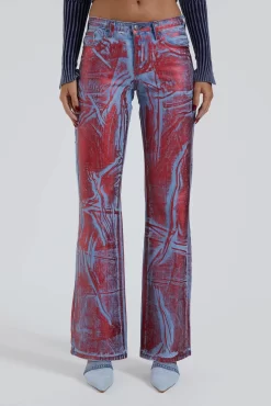 Elevate your look with the Midtown Metallic Jeans. Featuring a low-rise fit and PU patch pocket. This style has been crafted with blue and red distressed foil technique. Complete the ensemble with the matching corset top.