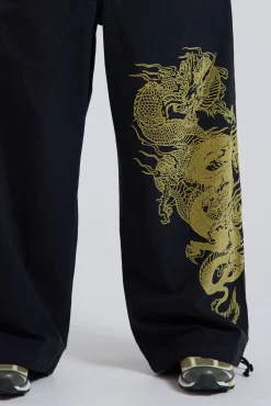 Designed with an oversized fit and a combination of metal eyelets, zip fly and adjustable cotton drawcord, our NY Dragon Flock Parachute Cargo Pants deliver refined luxury and ultimate comfort. Details such as a pleated knee and inside leg darts ensure a perfect fit, while a six-pocket styling and a unique airpod pocket provide functional convenience. Elevate any look with this timeless and classic silhouette.