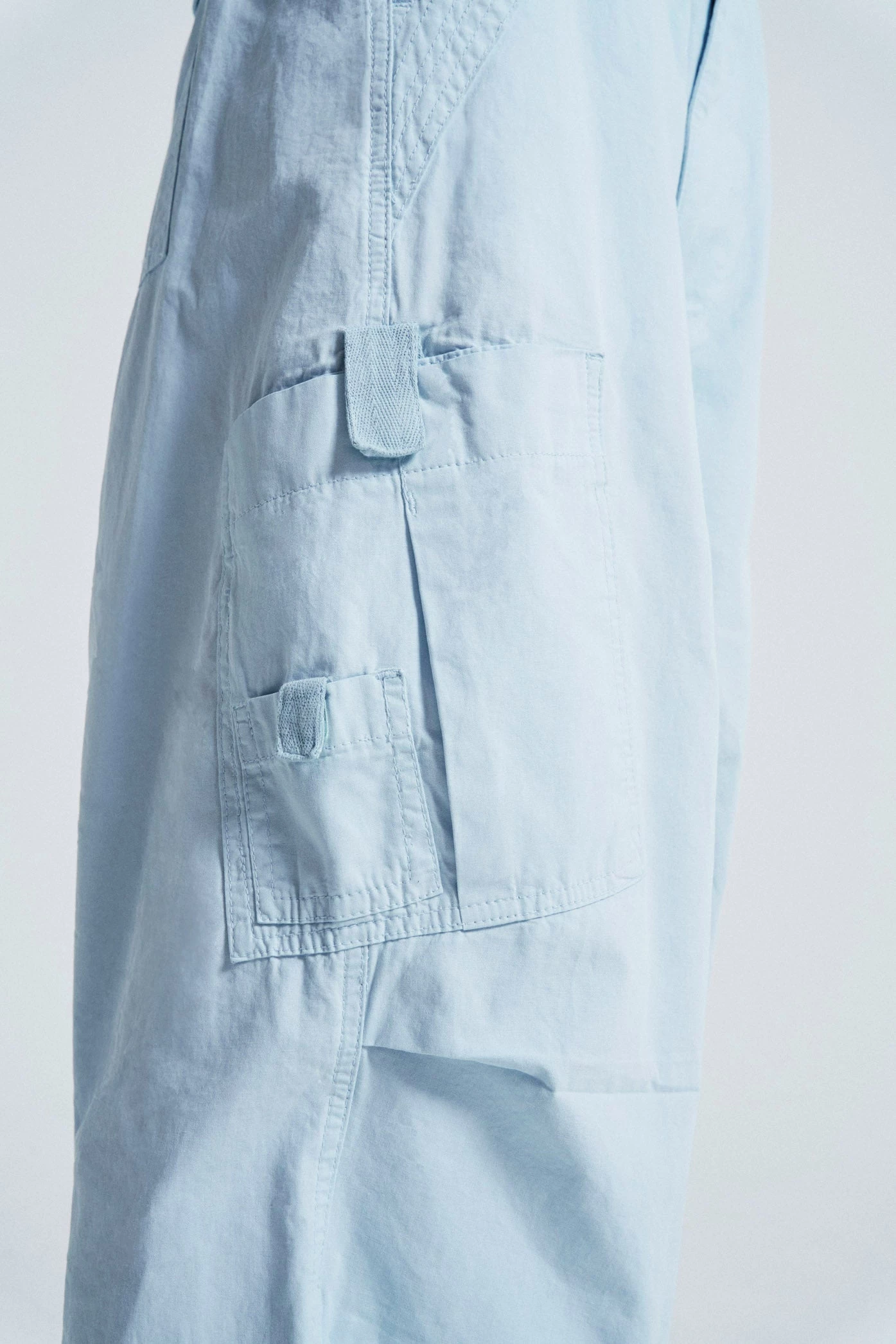 Designed with an oversized fit and a combination of metal eyelets, zip fly and adjustable cotton drawcord, our Powder Blue Parachute Cargo Pants deliver refined luxury and ultimate comfort. Details such as a pleated knee and inside leg darts ensure a perfect fit, while a six-pocket styling and a unique airpod pocket provide functional convenience. Elevate any look with this timeless and classic silhouette.