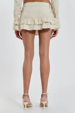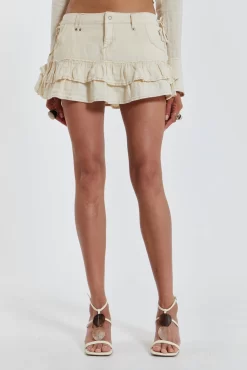 Refresh your wardrobe with the Santal Cargo Skirt. Crafted from an ecru linen fabric, this mini-length skirt features a double layer waistband with edge stitching along with a gathered edge and lace up side detailing. Complete the ensemble with the matching cargo shirt.