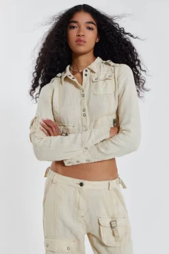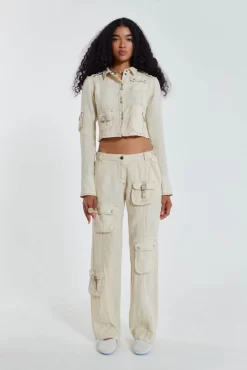 Refresh your wardrobe with the Santal Cargo Shirt. Crafted from an ecru linen fabric, this Y2K style cargo shirt features contrast camel stitching, antique silver hardware and functional cargo pockets. Complete the ensemble with either the matching cargo skirt or cargo trousers.