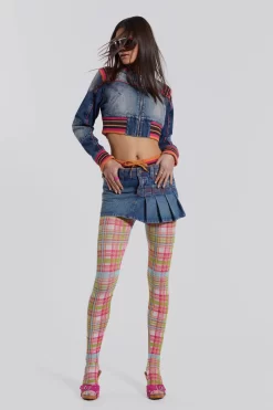 Introducing the Sherbet Cropped Denim Jacket. Constructed from heavyweight denim and decorated with piping detail, this cropped fit is finished with ribbed collar and cuffs. Complete the look with the matching mini skirt.