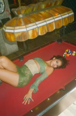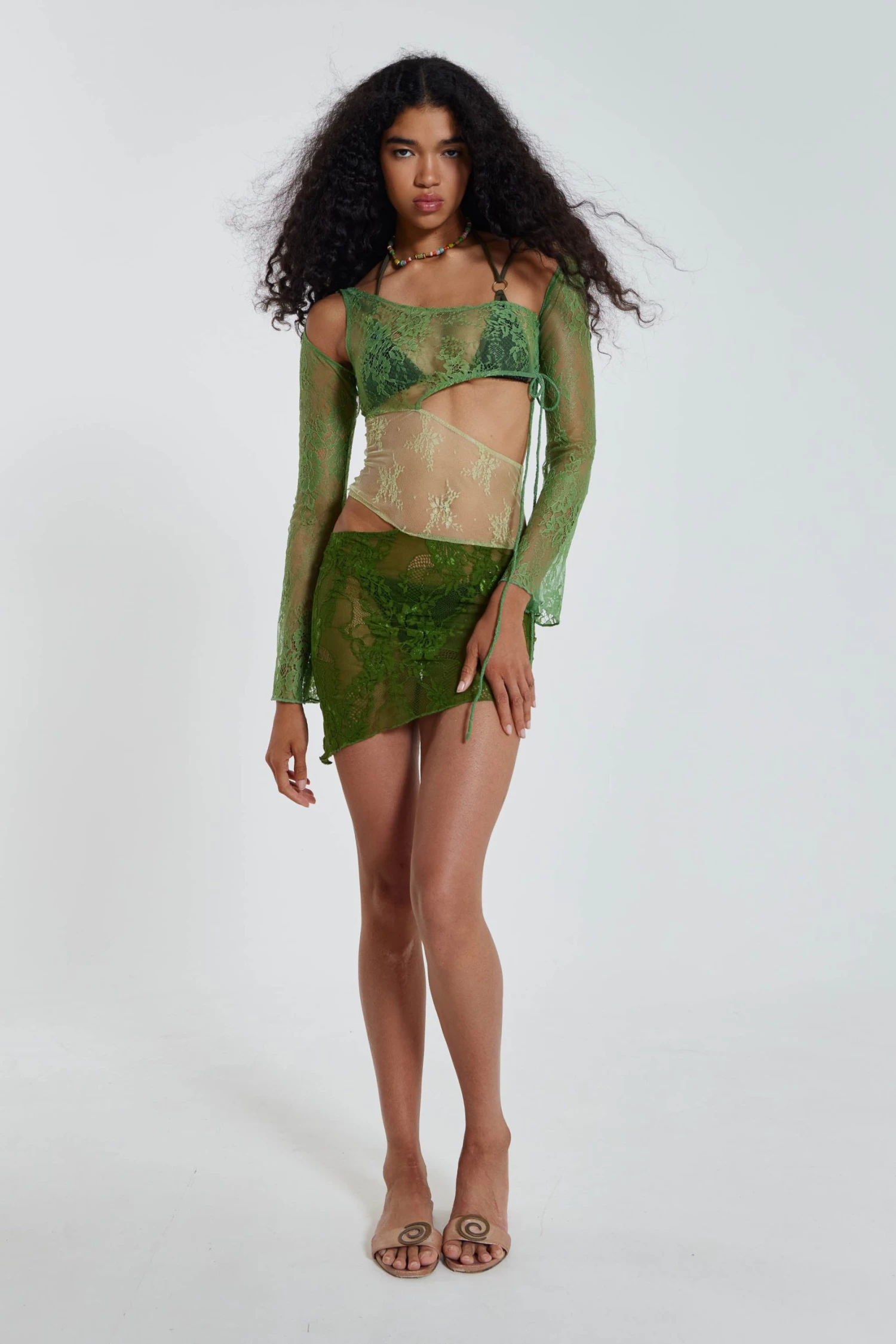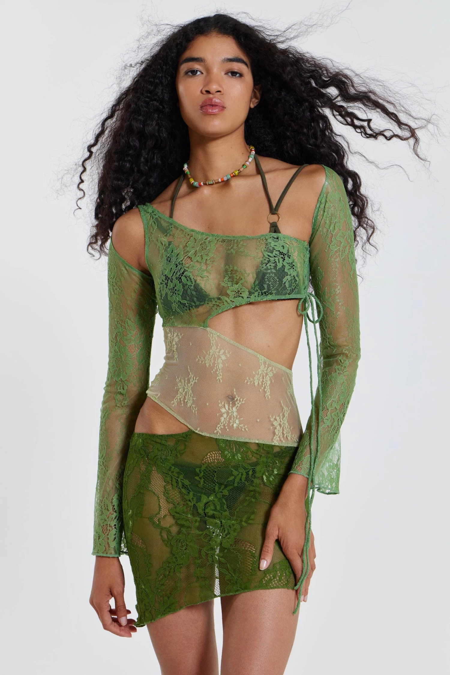 Introducing the Siren Dress “ Crafted from a non-stretch sheer khaki green lace fabric, this mini-length dress features an asymmetrical fit with long sleeves and a cut out slash detail.
