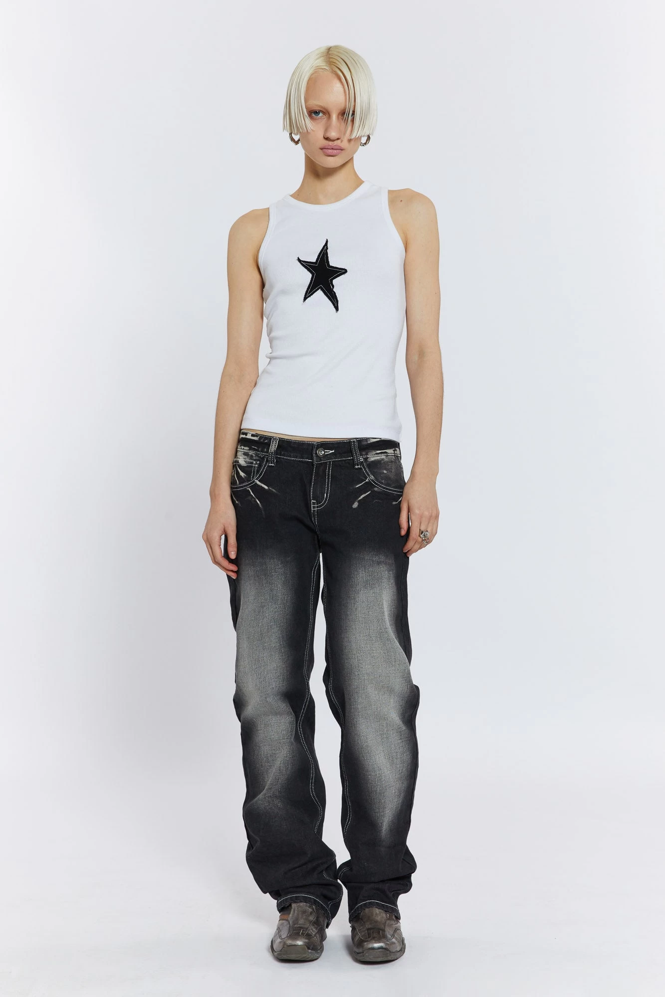 Our Starstruck Vest is crafted from a white rib jersey fabric, combined with a black star applique and contrast black stitching. This vest offers a comfortable fit with its shrunken silhouette.