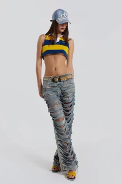 Elevate your wardrobe with these extreme slashed denim jeans. Crafted with a raw edge finish, these blue slashed jeans command attention with their low rise and straight leg silhouette and completed with classic back pockets.