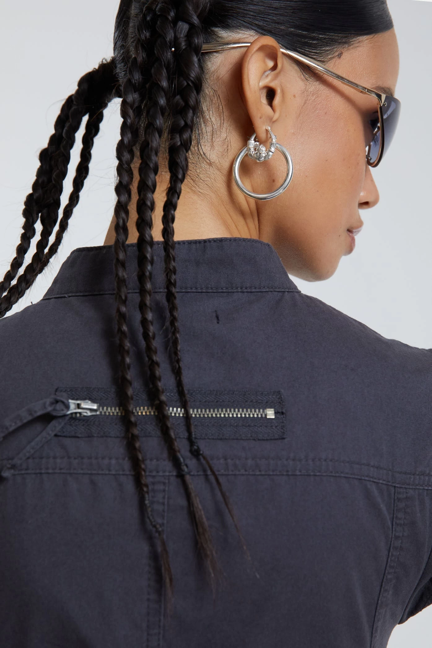 Crafted with a high neck, zip up front and short sleeves the Vintage Grey Cargo Dress features a detachable JL buckle webbing belt in a mini length.