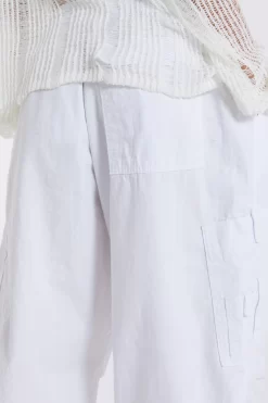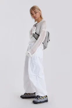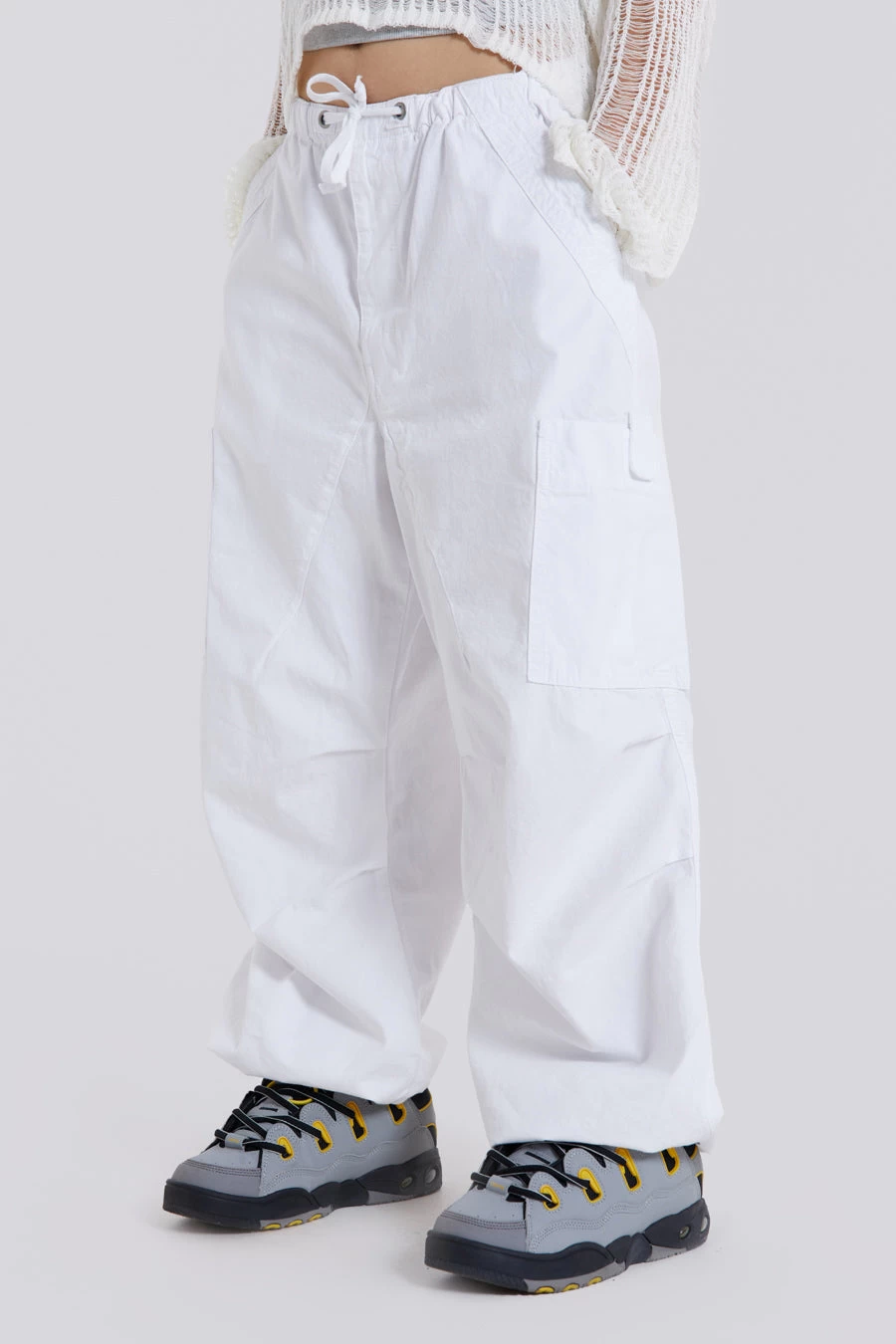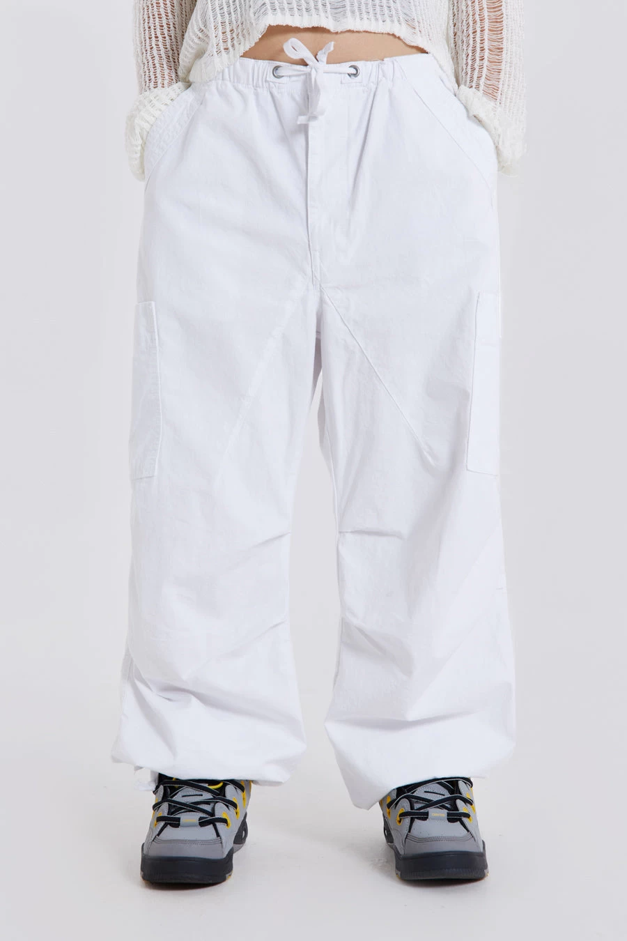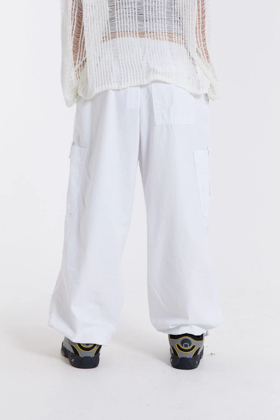 Designed with an oversized fit and a combination of metal eyelets, zip fly and adjustable cotton drawcord, our Pure White Parachute Cargo Pants deliver refined luxury and ultimate comfort. Details such as a pleated knee and inside leg darts ensure a perfect fit, while a six-pocket styling and a unique airpod pocket provide functional convenience. Elevate any look with this timeless and classic silhouette.