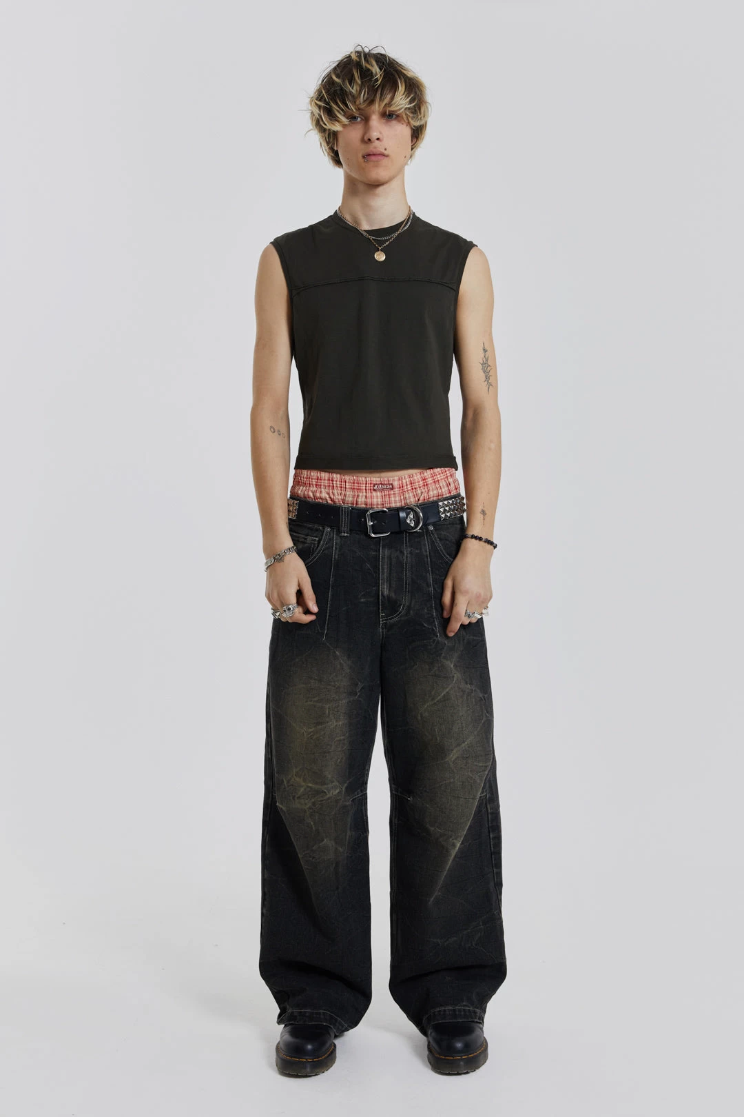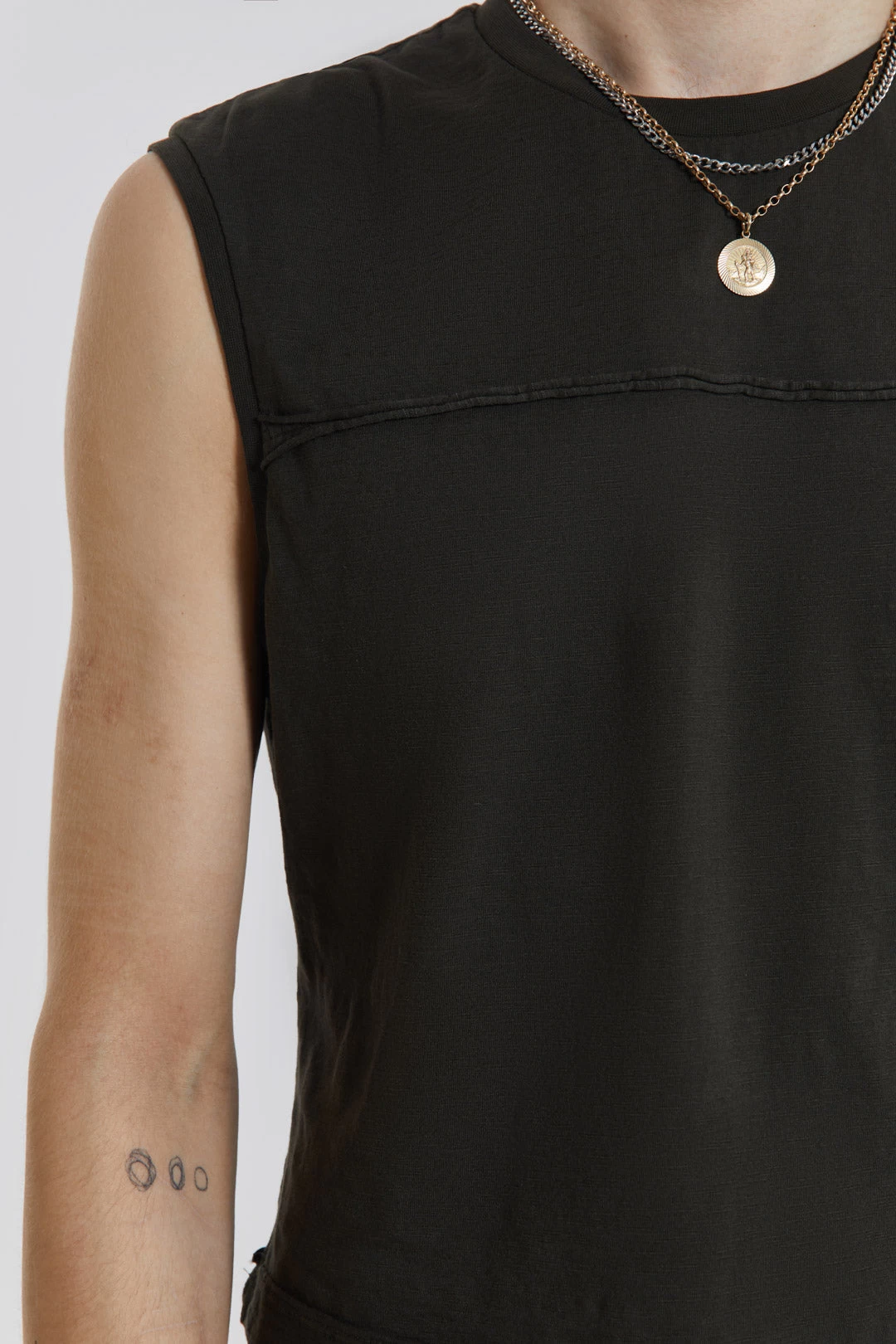 Introducing the Khaki Slub Tank. Crafted from a lightweight khaki slub jersey, with rib sleeve and neck finish with an exposed raw yoke seam.