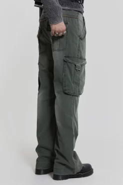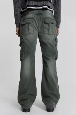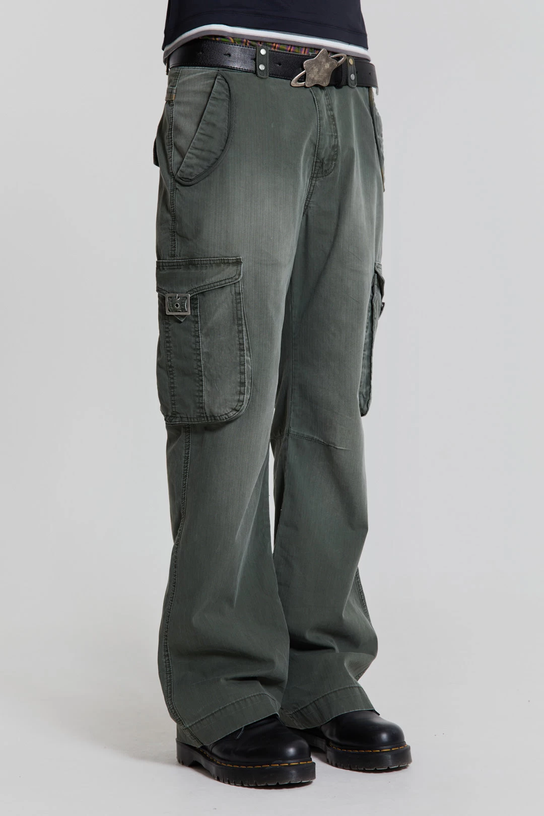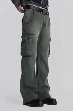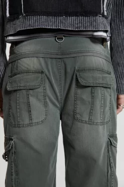 Constructed from a lightweight herringbone twill fabric, these trousers are designed in a straight, flared leg profile with a fixed waistband and mid-low rise fit. Additionally, cargo pockets with laid-on flap closures and side entry pockets are present and finished with antique silver hardware and a vintage wash.