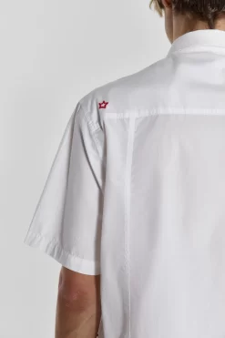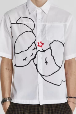 The Kiss Me Quick Shirt is crafted from a classic white cotton shirting fabric in a slightly cropped fit. Exclusively available at Jaded with an elegant red and black placement screenprint designed by Poster.