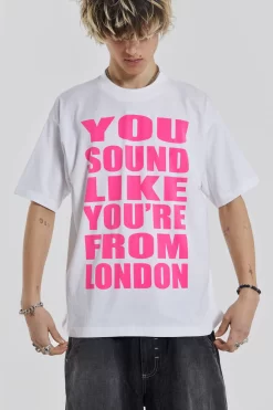 Introducing the London Sound Tee. Crafted from single jersey fabric, this oversized t-shirt features a bold neon pink ËœYou sound like you’re from London’ screen print.