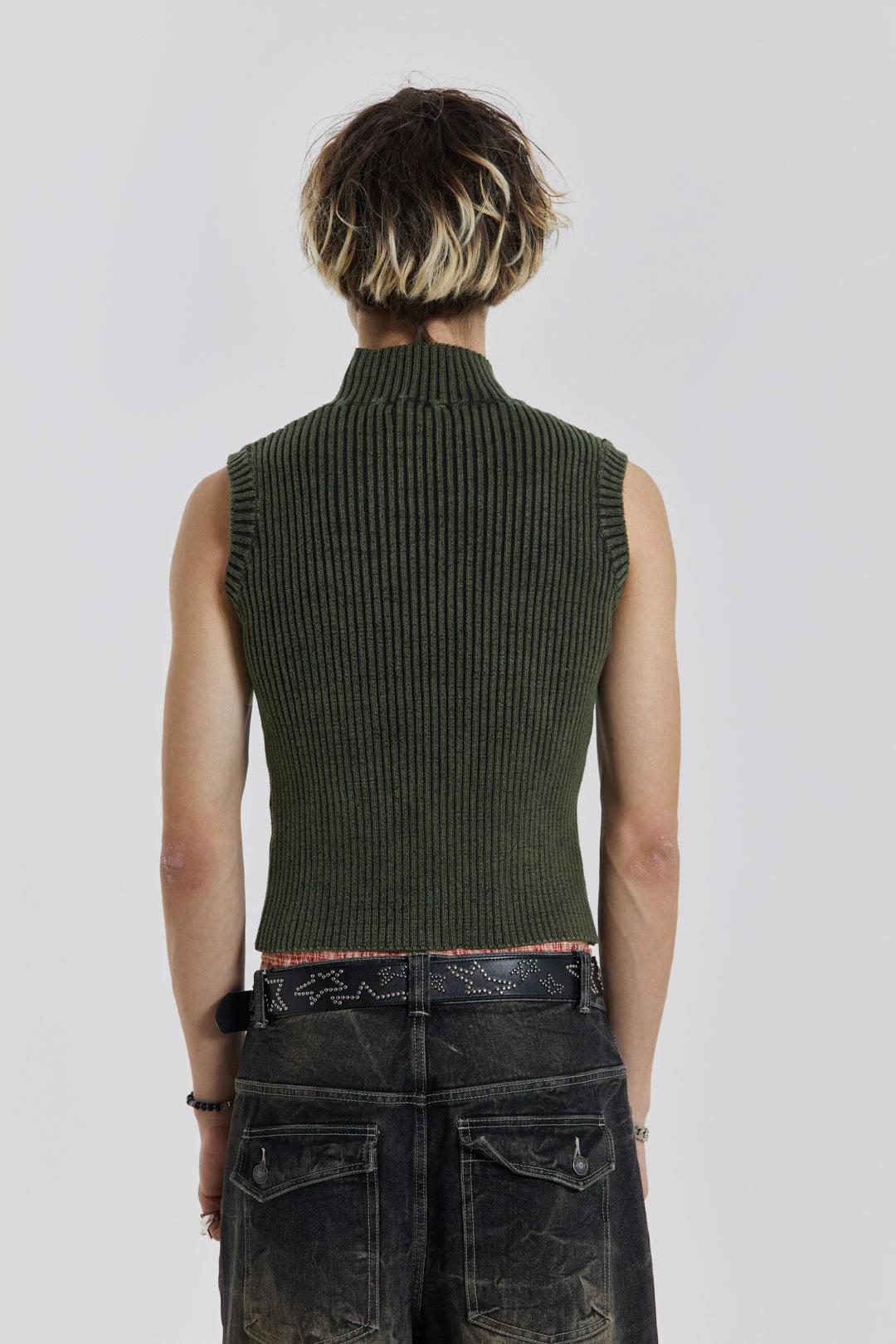 Introducing the Lure Asymmetric Knit, crafted using an acid dye effect in a moss green and black colourway. This piece features an asymmetric zip closure, double ended zip, high neck and rib finish at armhole.