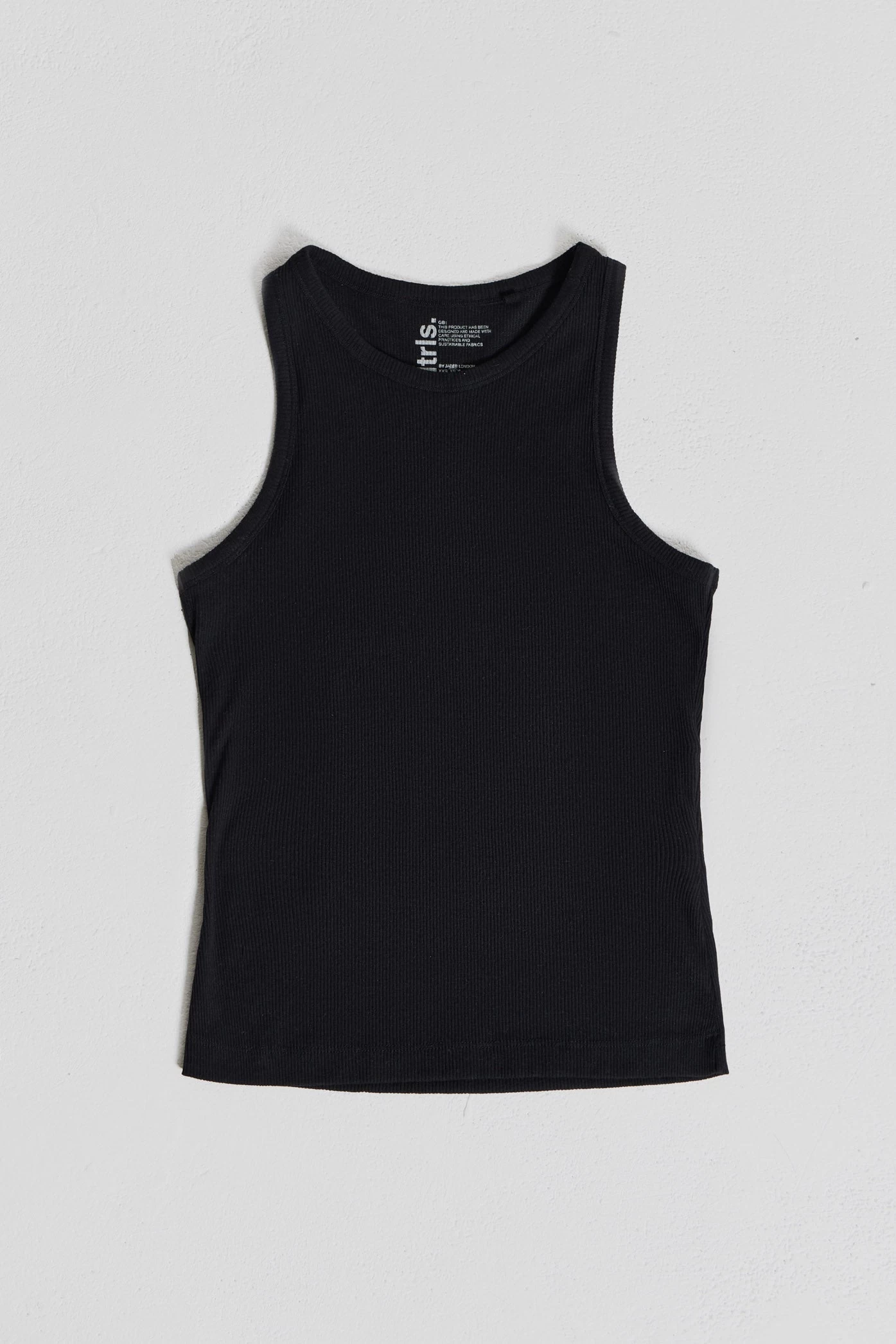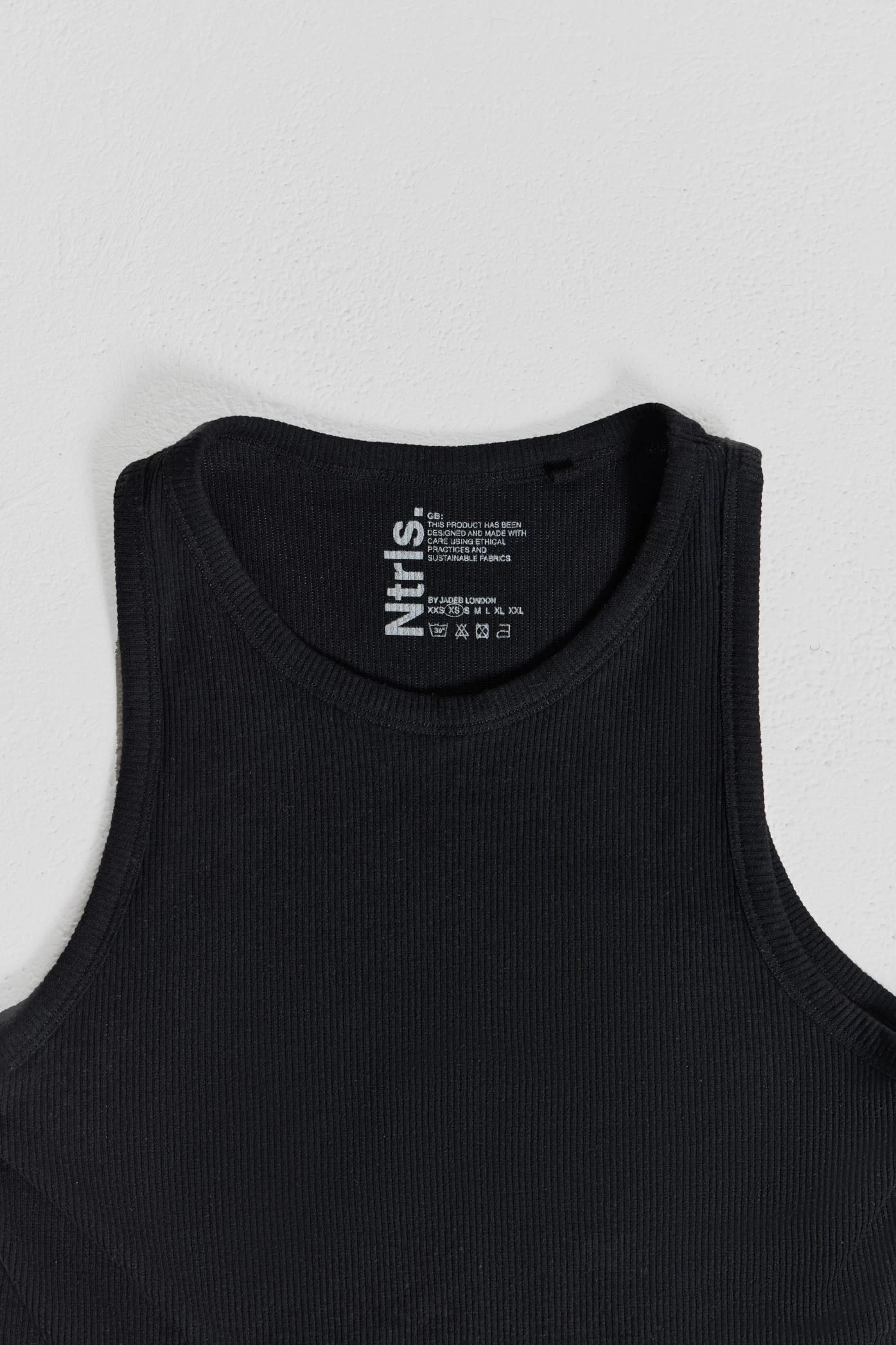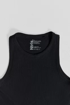 The NTRLS Black Rib Vest is crafted from a ribbed jersey fabric with a rib bound neck and armhole, creating a snug fit in a black colourway.
