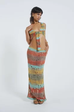 Elevate your wardrobe with this multi knitted top, crafted from a distressed laddered knit fabric in a cropped-fit, featuring a plunged wrap-around style. Complete your look with the matching knitted maxi skirt for a coordinated beachwear ensemble.
