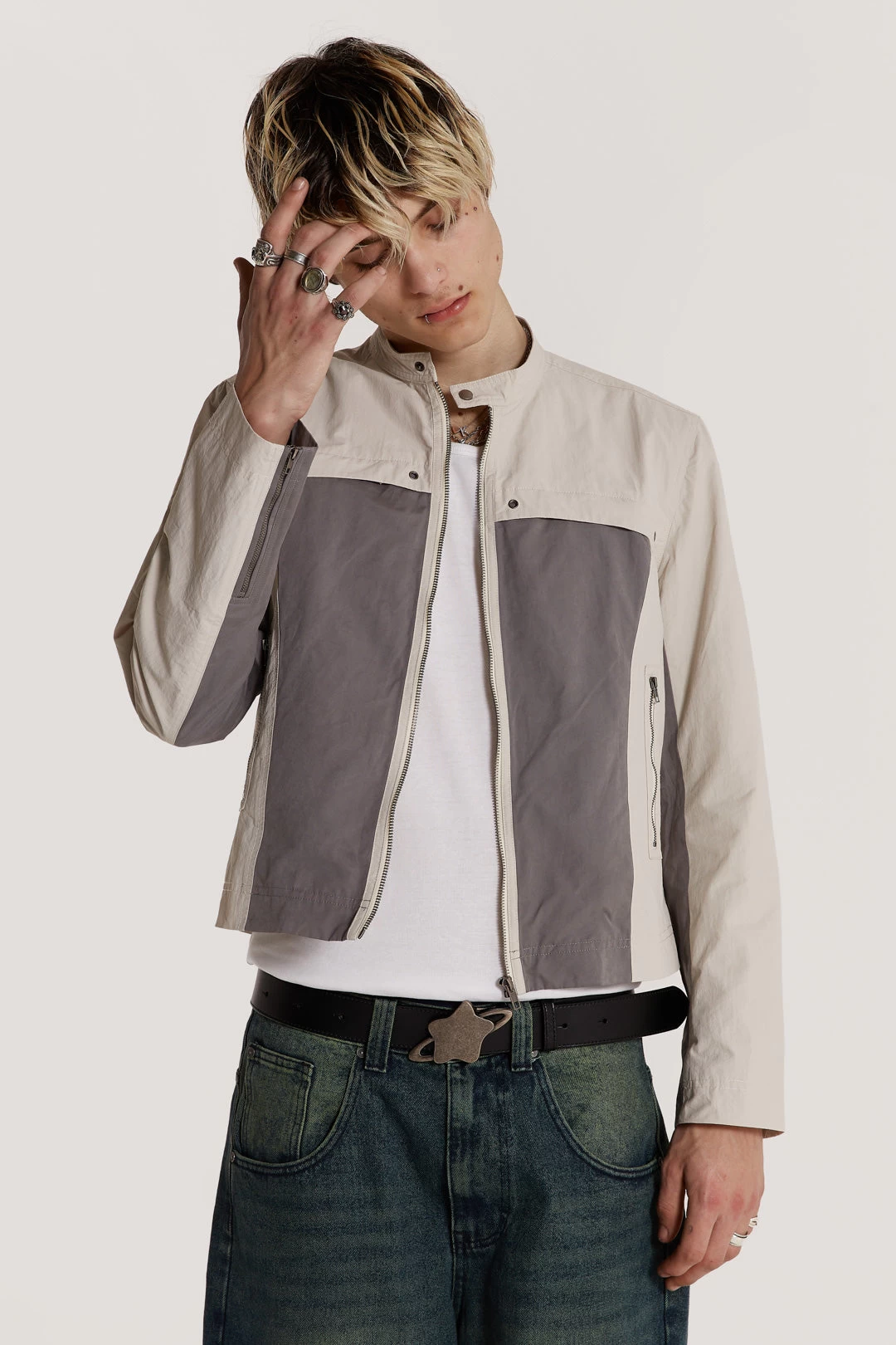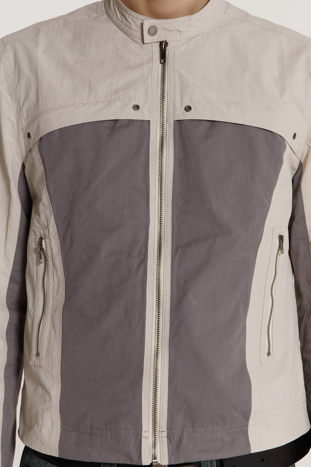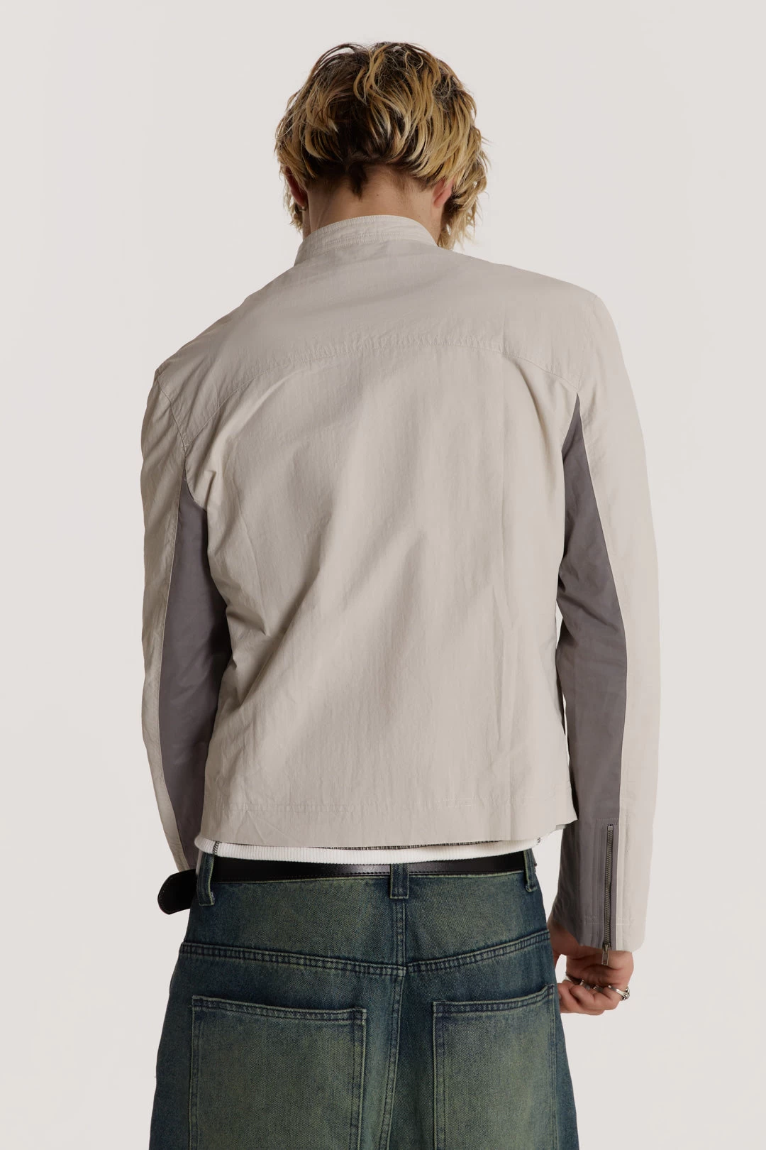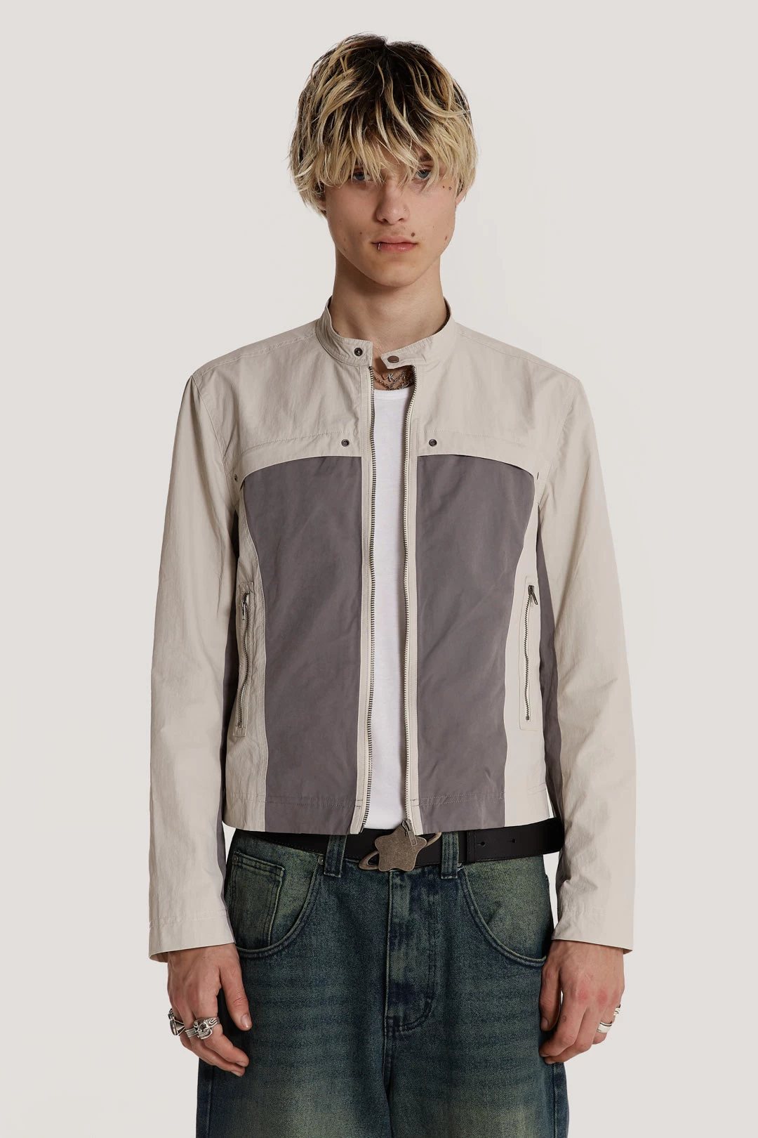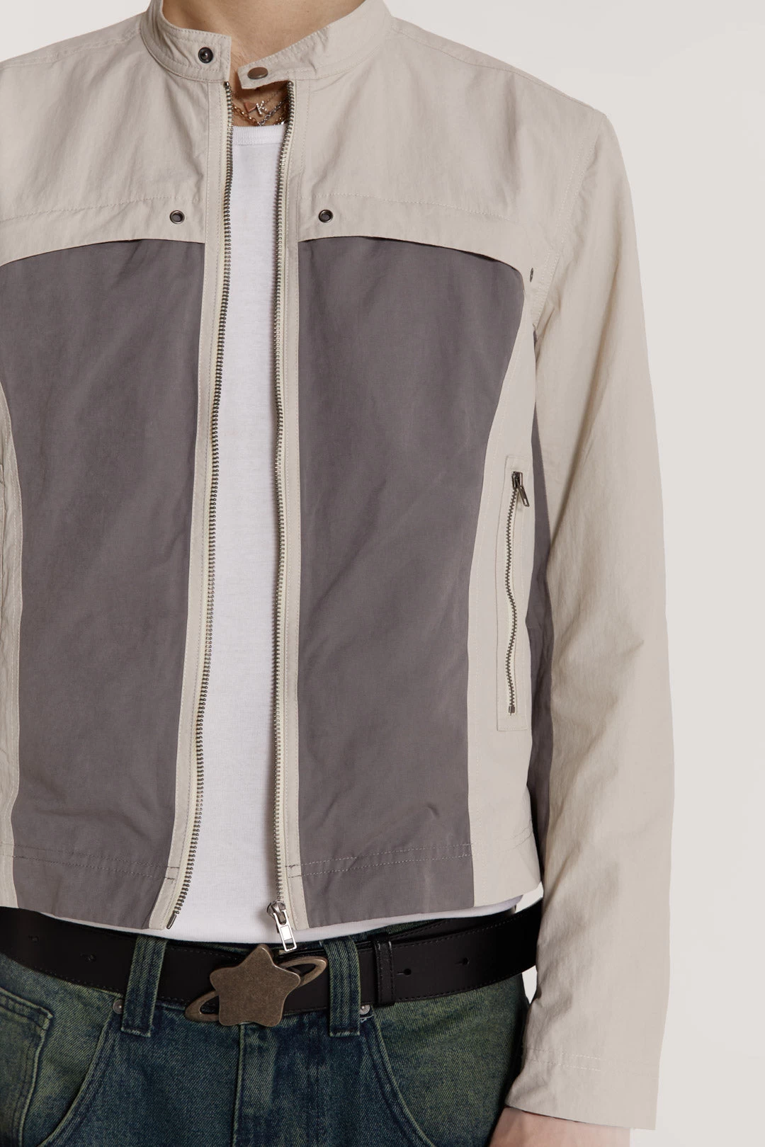 The Rider Jacket is crafted from nylon and tailored in a shrunken cropped fit. The Jacket is finished with antique silver hardware and snap fastening at the neck.