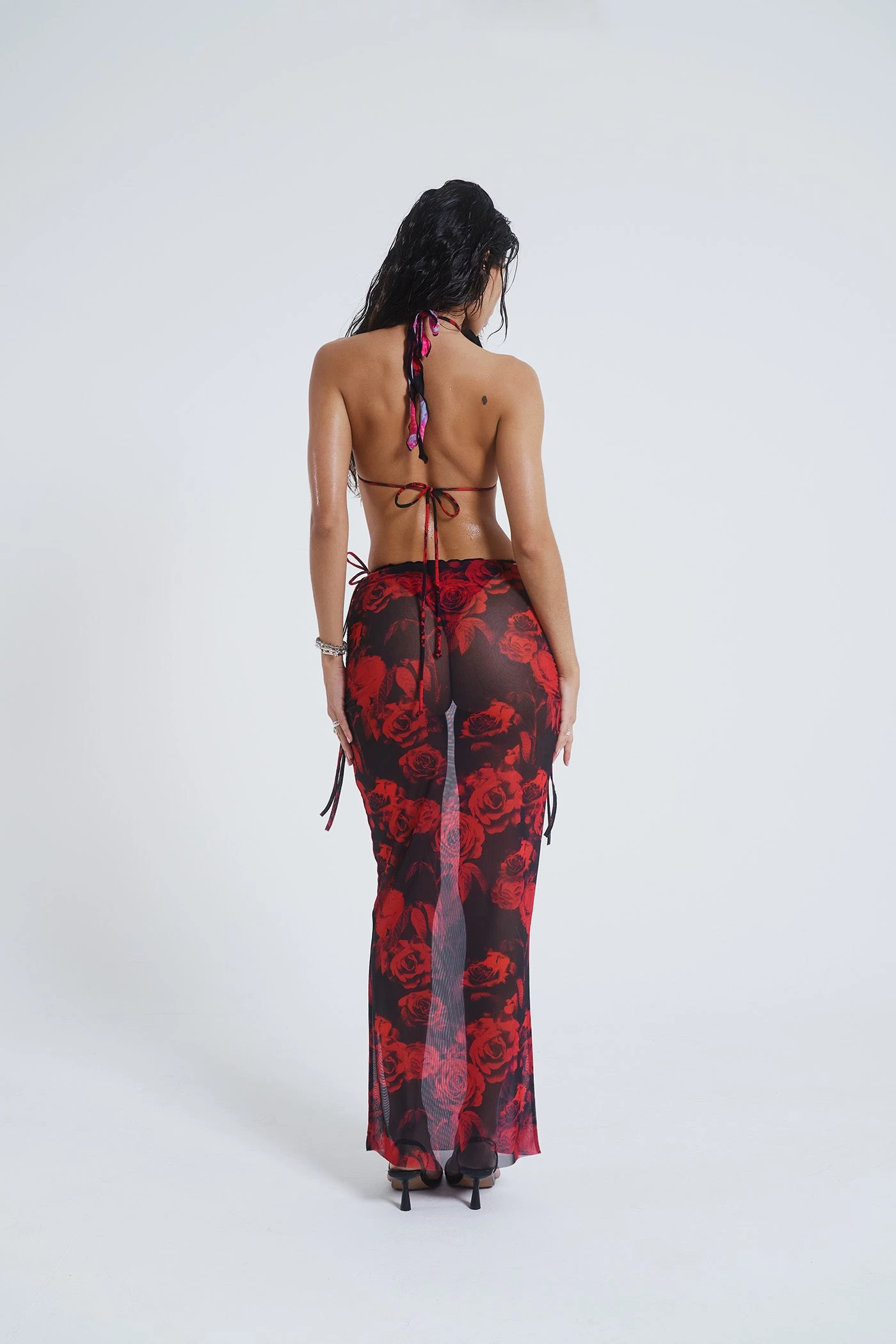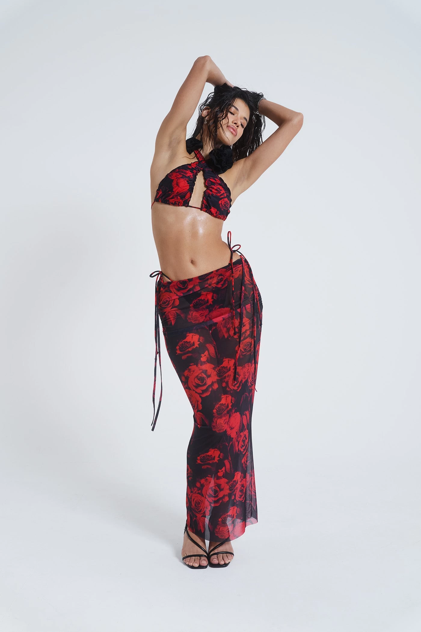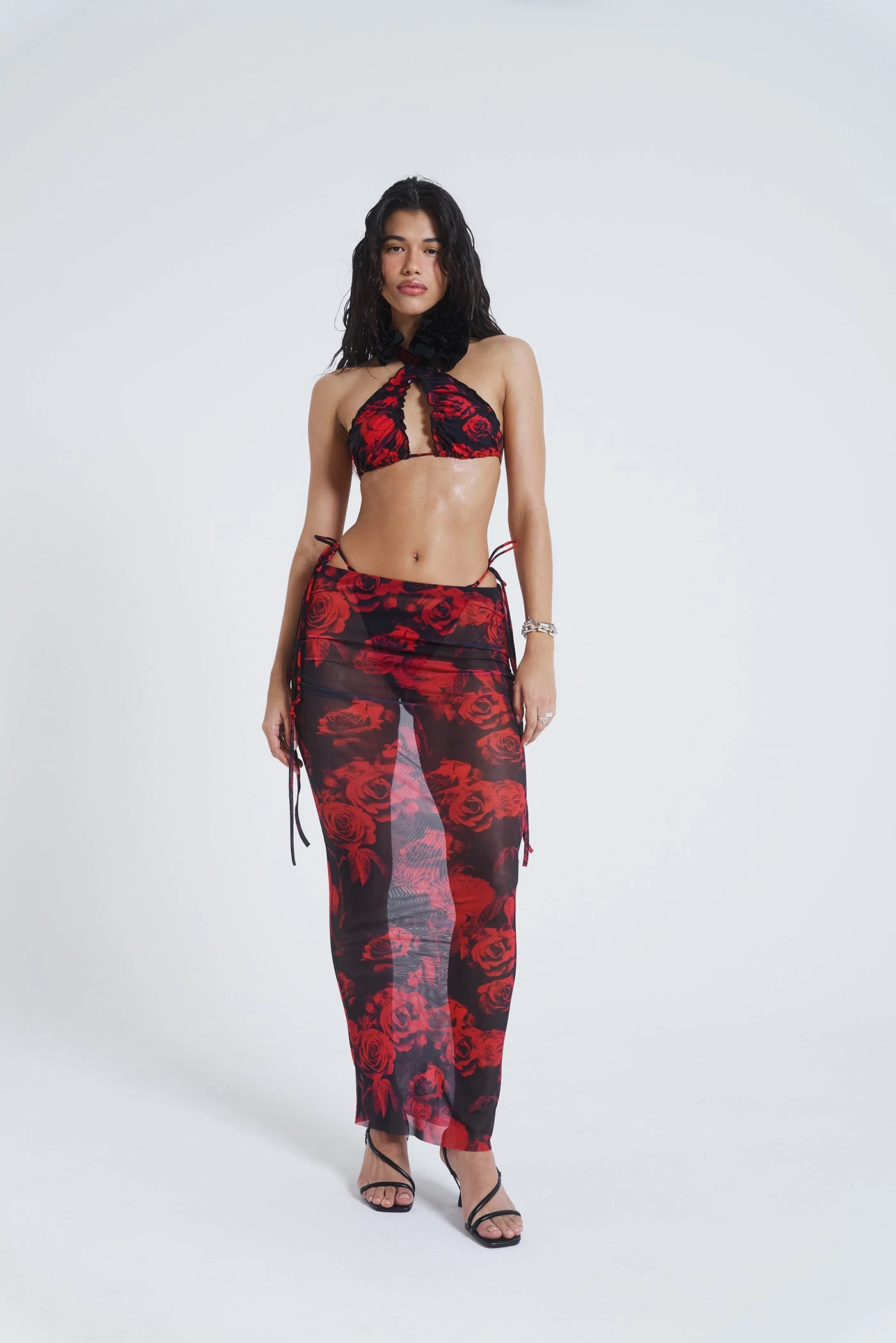 Presenting the lightweight mesh maxi skirt, designed in a red and black Gothic floral print which is heavily featured in the Prima Swim collection.