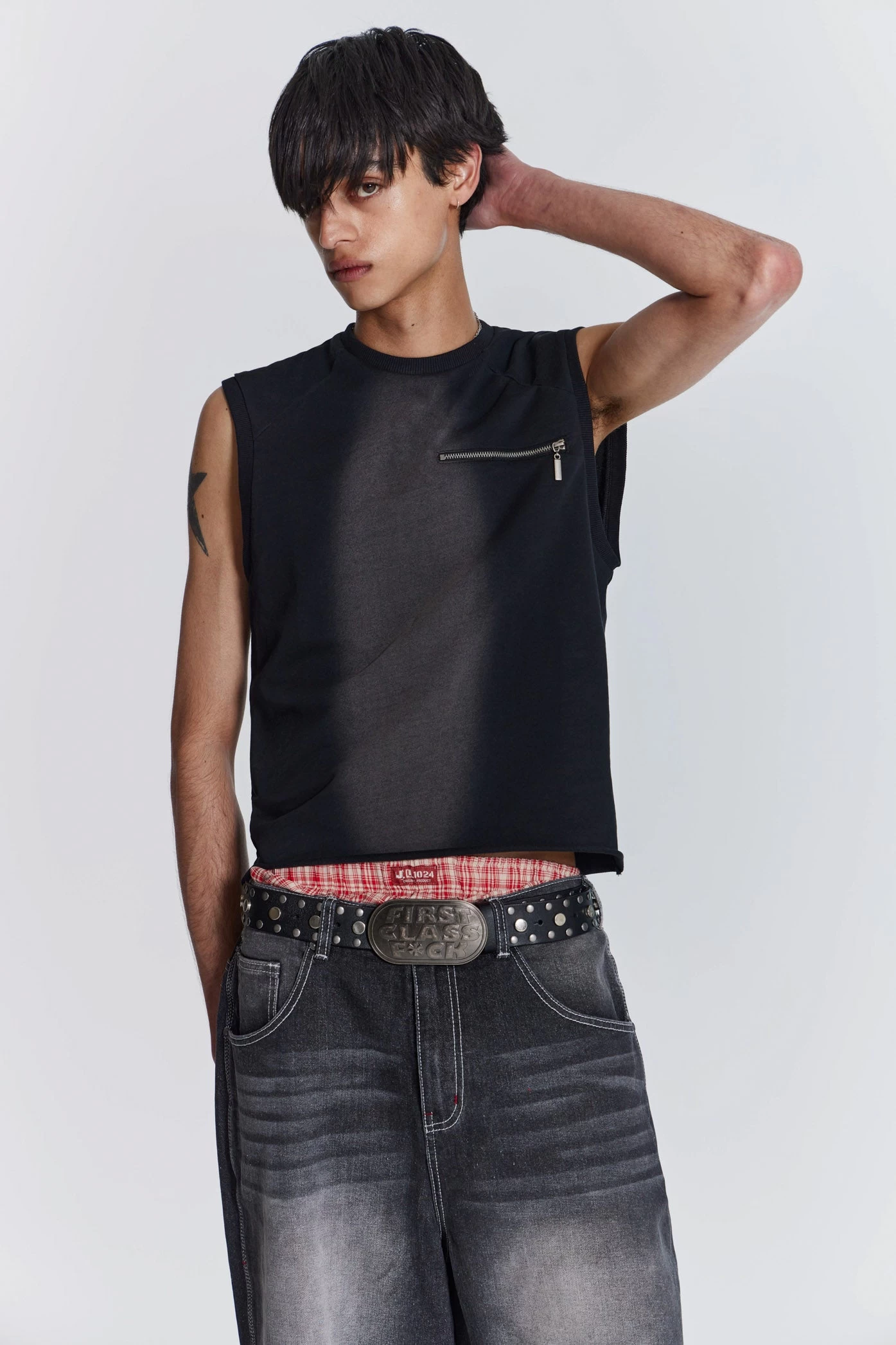 Introducing the Shade Loopback Tank, crafted from a loopback sweat fabric in a washed black colourway, with a placement acid wash. The tank is detailed with a zip mock pocket with red lining, raglan seam detail and ribbed neck and armhole.