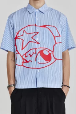 The Stereo Stripe Shirt is crafted from a soft blue stripe bottom fabric and cut to a boxy fit with a slightly cropped length. Boasting a front yoke pocket detail, the shirt is finish with a large placement screen print, designed exclusively for Jaded by Poster.