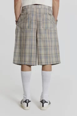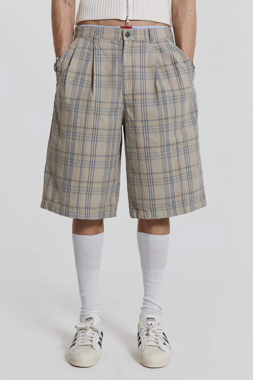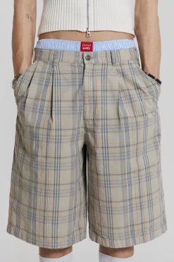 This style is crafted from cotton check fabric that has been garment dyed and features a fixed waistband along with twin pleats to the front to add volume and creating a slightly low rise, wide leg style with a hem that sits below the knee.