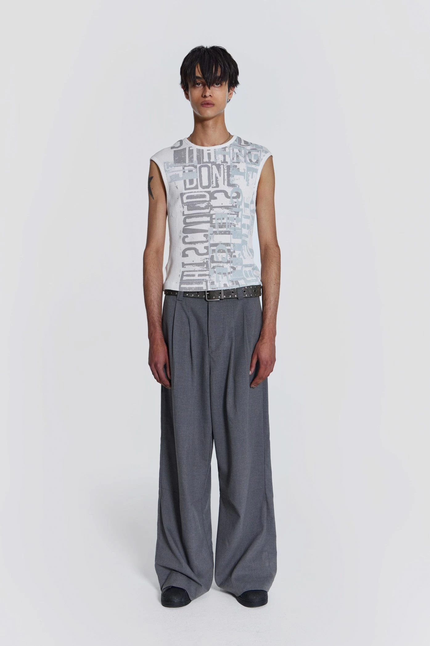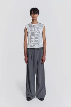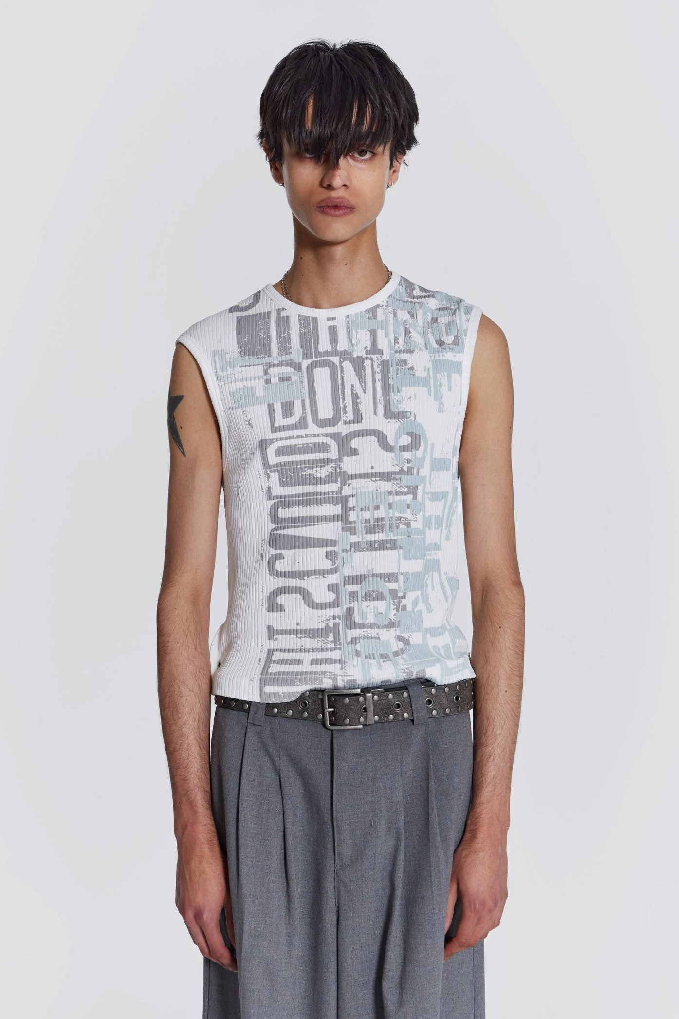Crafted from a ribbed jersey fabric, the Thesis Tank features a two-tone screen print with a fitted shape that is slightly cropped in the body, finished with a bound neck and arm hole.