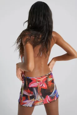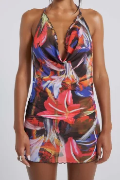 Introducing the Tropical Haze Beach Dress “ crafted in a lightweight fabric, featuring an abstract floral print this mini dress has a cowl neck with a tie-back neck fastening with an open back detail. Complete the ensemble with the matching bikini.