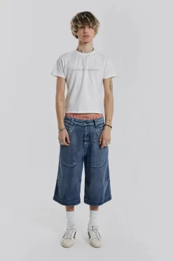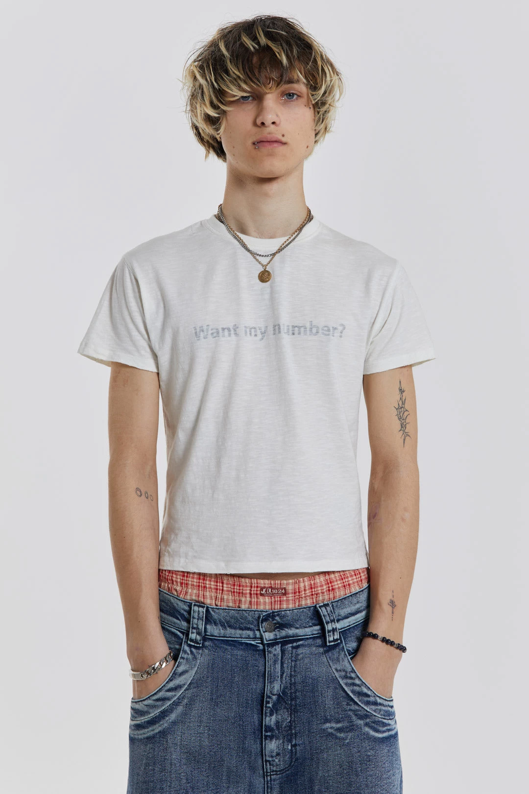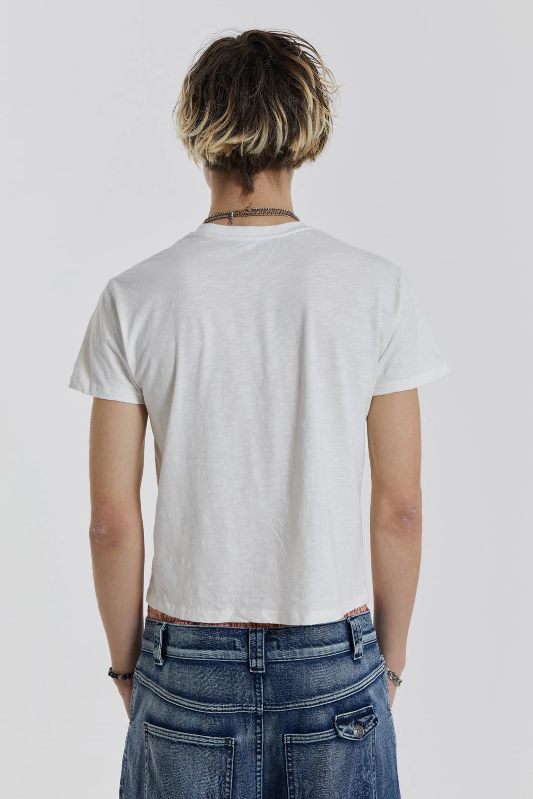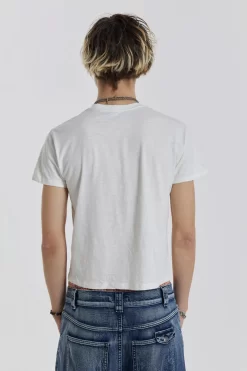 Crafted in a lightweight cotton jersey slub fabric, this off white tee features a reverse side slogan screen print, rib bound neck and distressing on the hem and neckline which gives the piece a heavy vintage washed look.