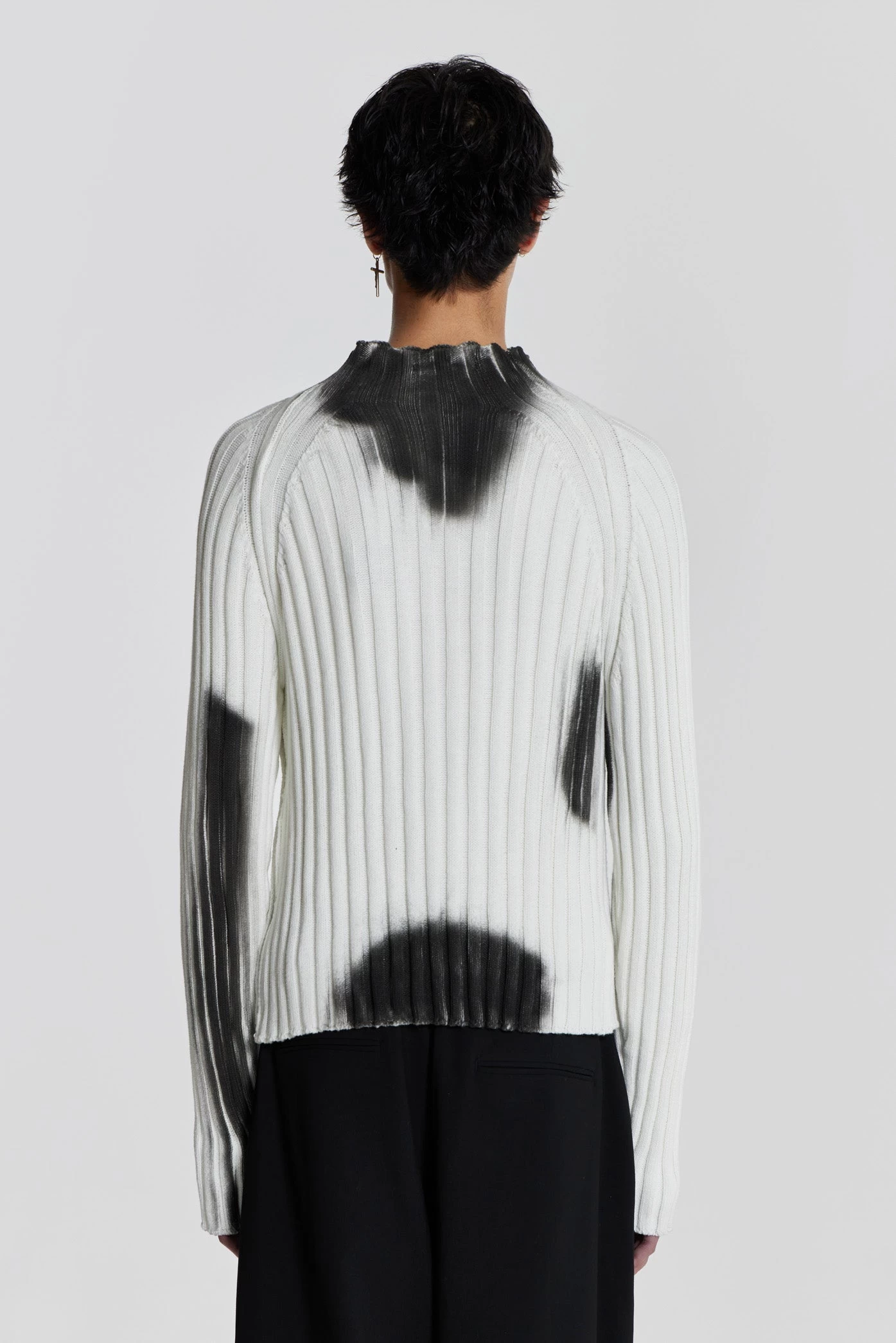 The White Asymmetric Luster Knit is crafted in a white wide rib knit fabric with a placement dye wash design, finished with an asymmetric double zip detail.