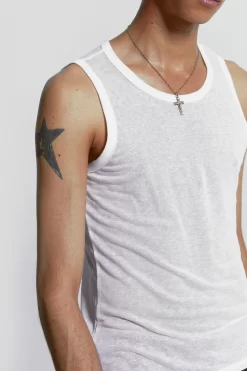 Our White Mist Vest is constructed with sheer fabric for a soft hand feel in a white colourway. The sleeveless vest is cut in a slightly cropped fit with a twisted side steam detail.